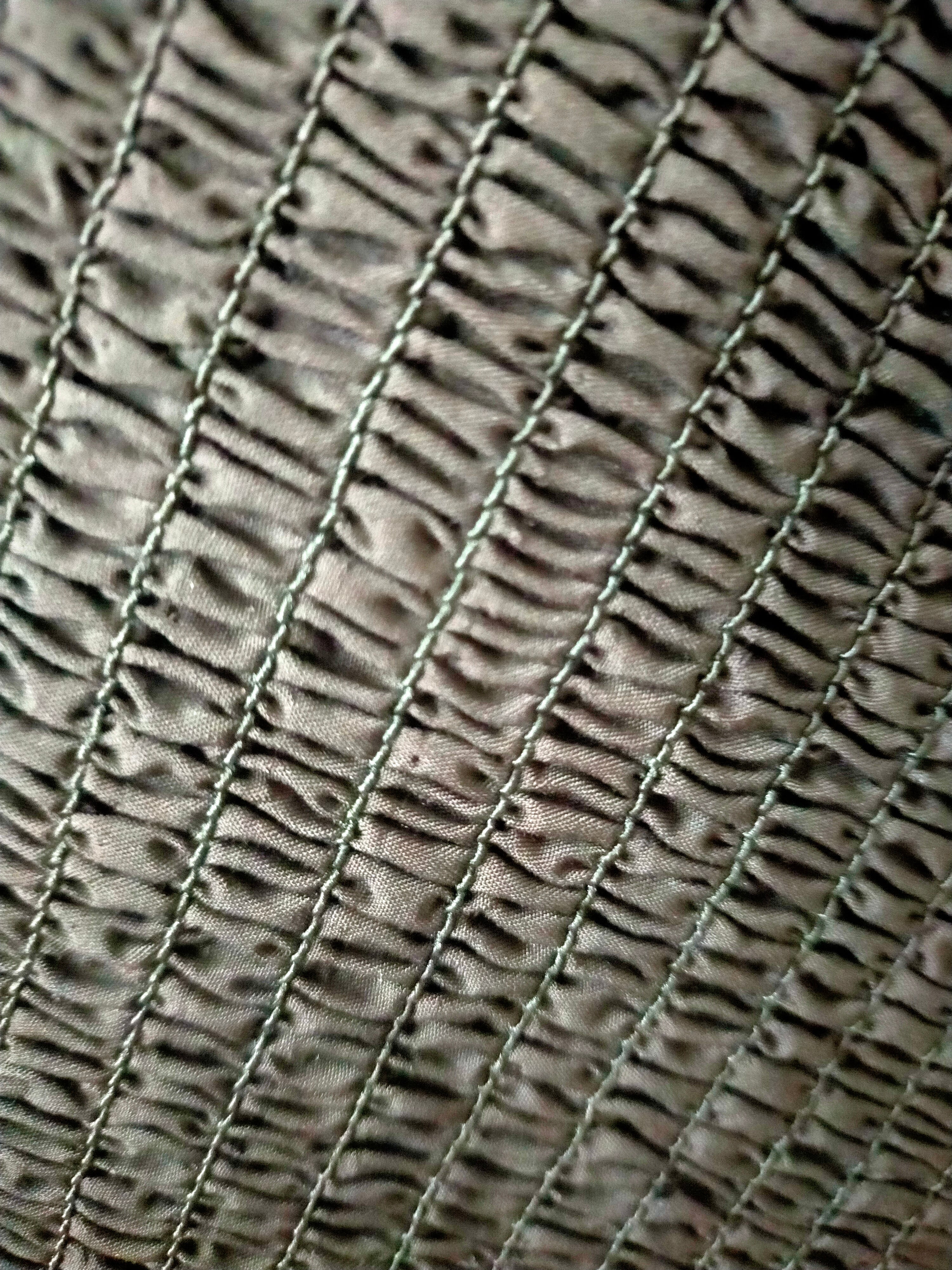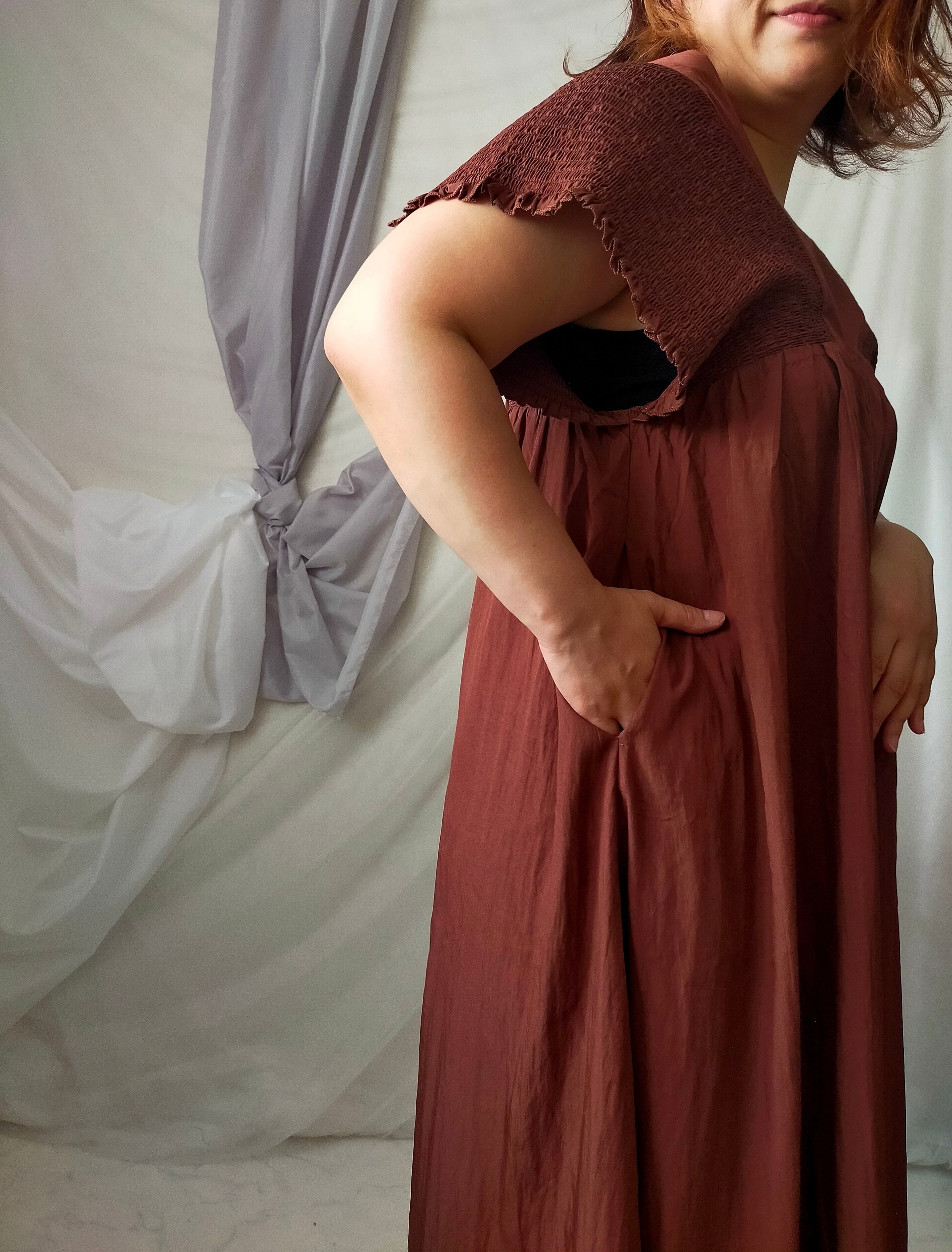 トレンドど真ん中の立体的なシャーリングデザインが魅力のVネックロングワンピース。