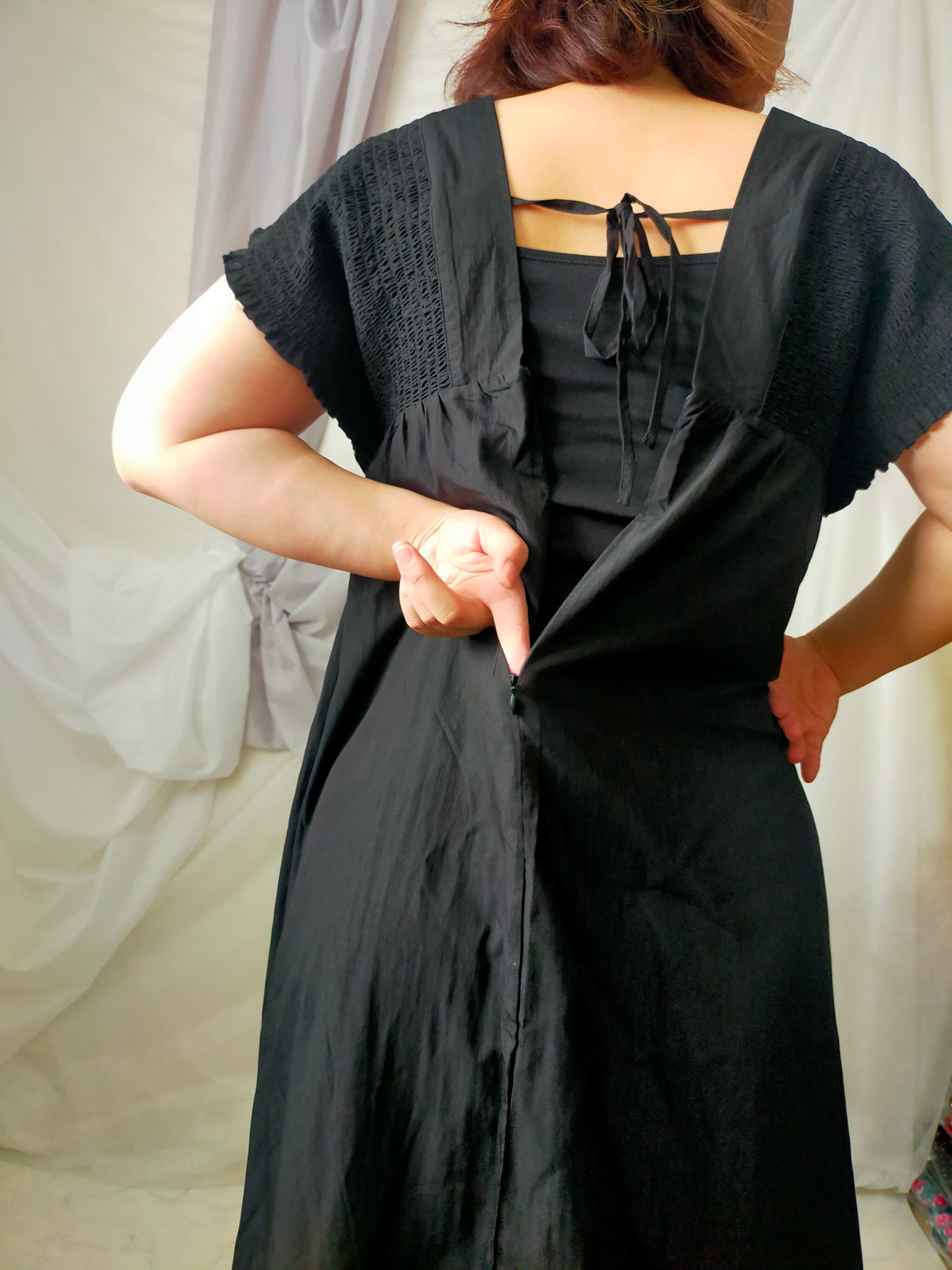 ちょうどよく着れました。背中にコンシールファスナーがあり脱着しやすいです。作り的にファスナーも上までではないので私の体の硬さでも1人でファスナーあげれました!