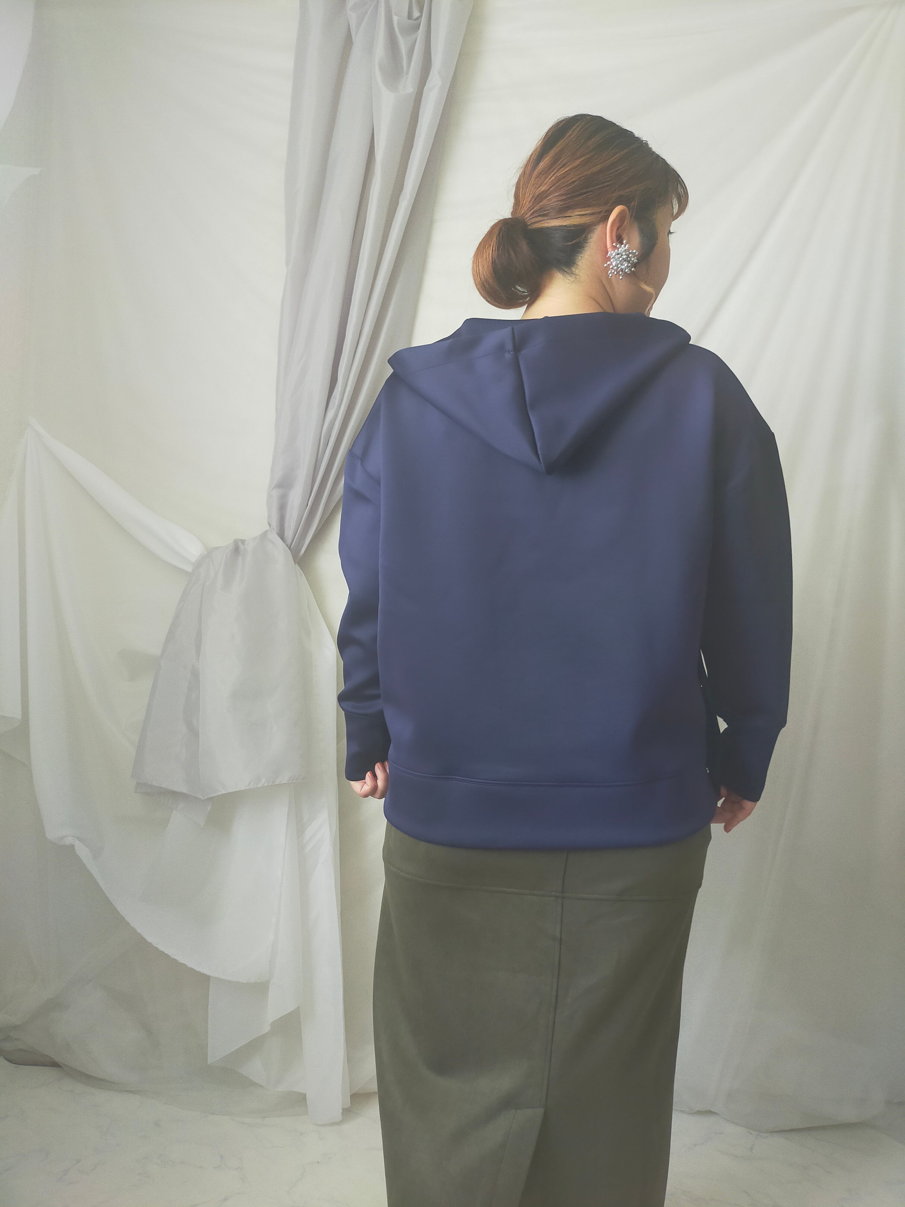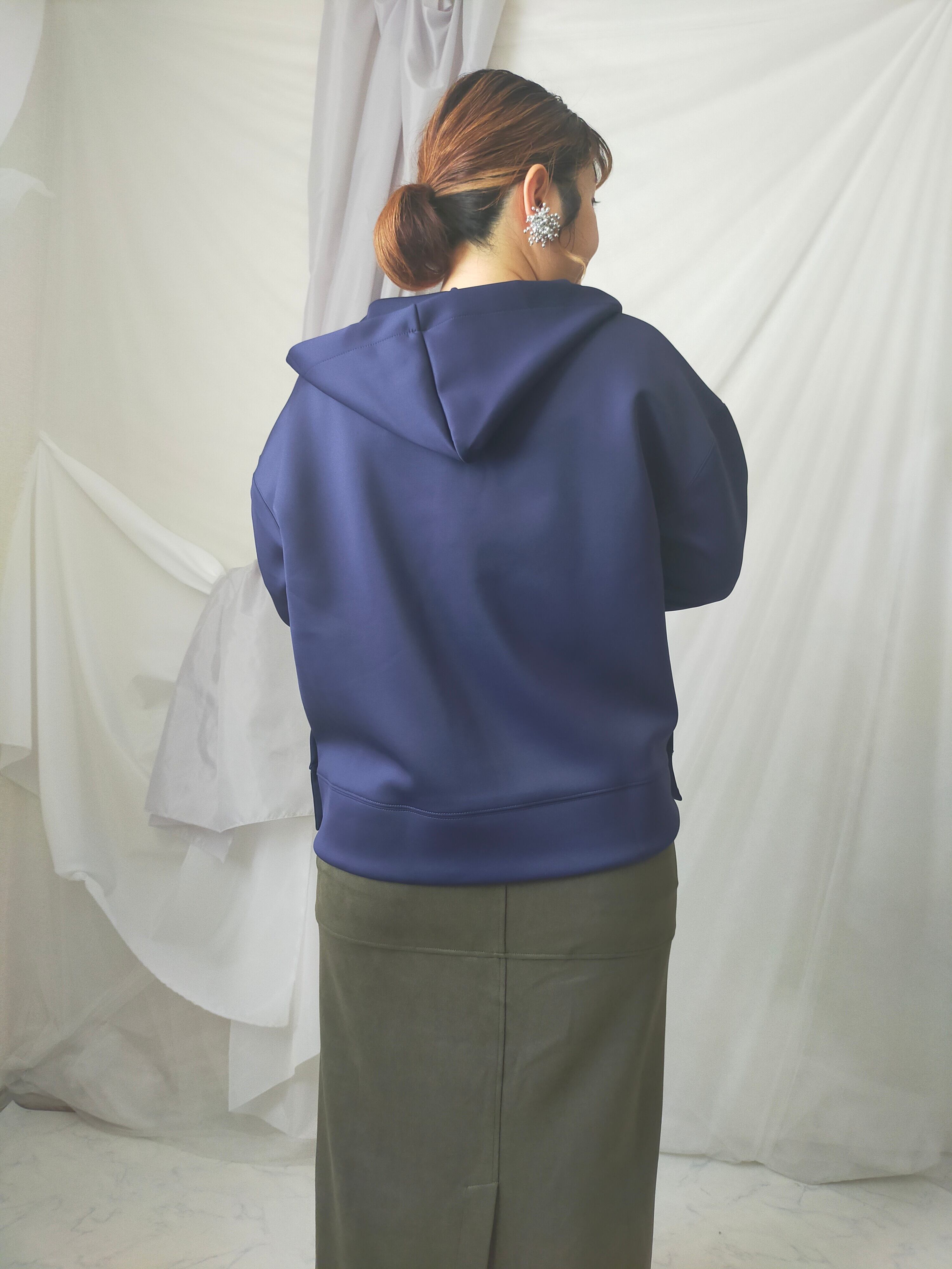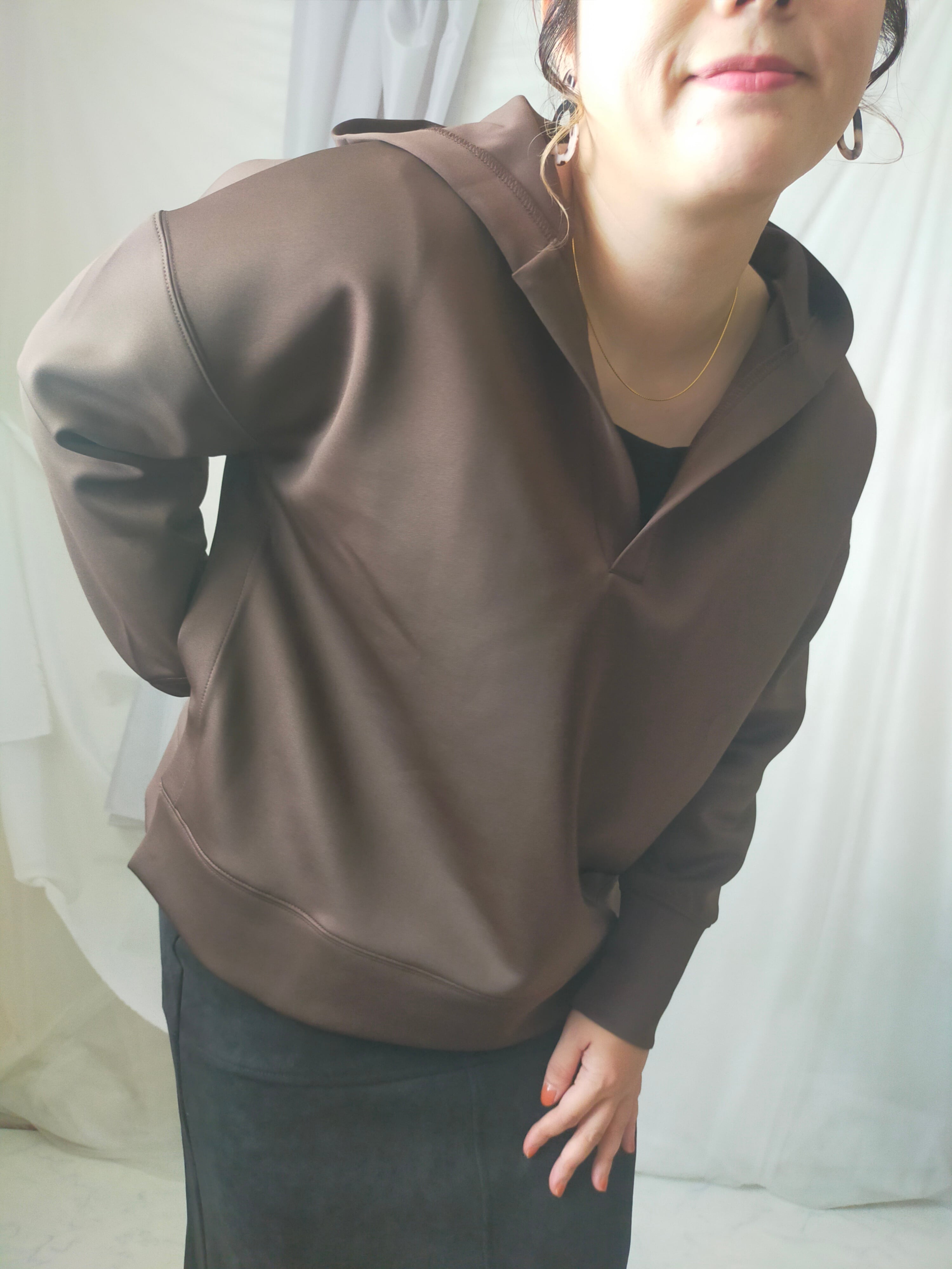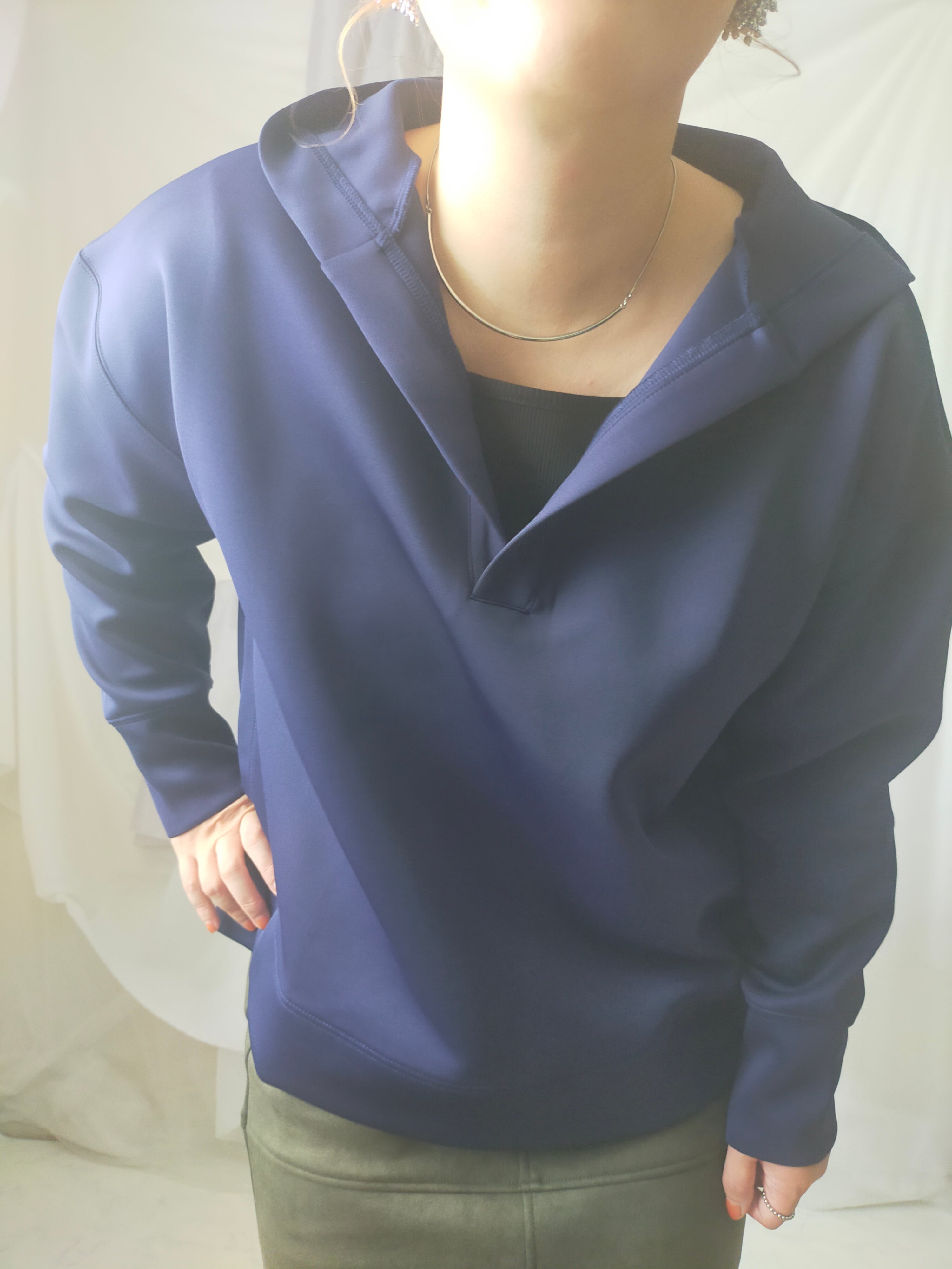 首周りすっきりさせたい派の方にオススメのプルパーカー!身幅ワイドでゆったりしています。ツルっとした生地なのでカジュアルすぎず着用できます。