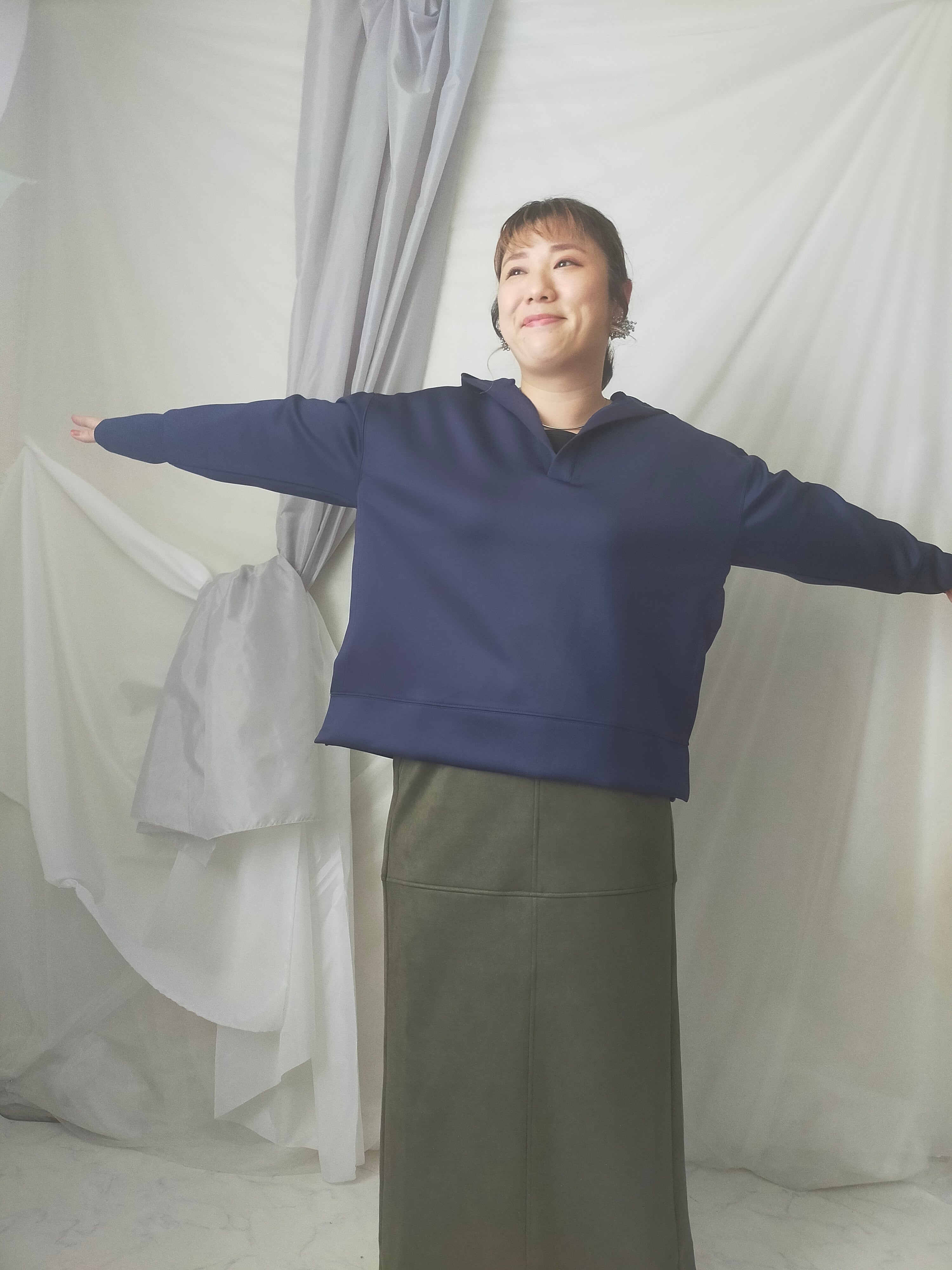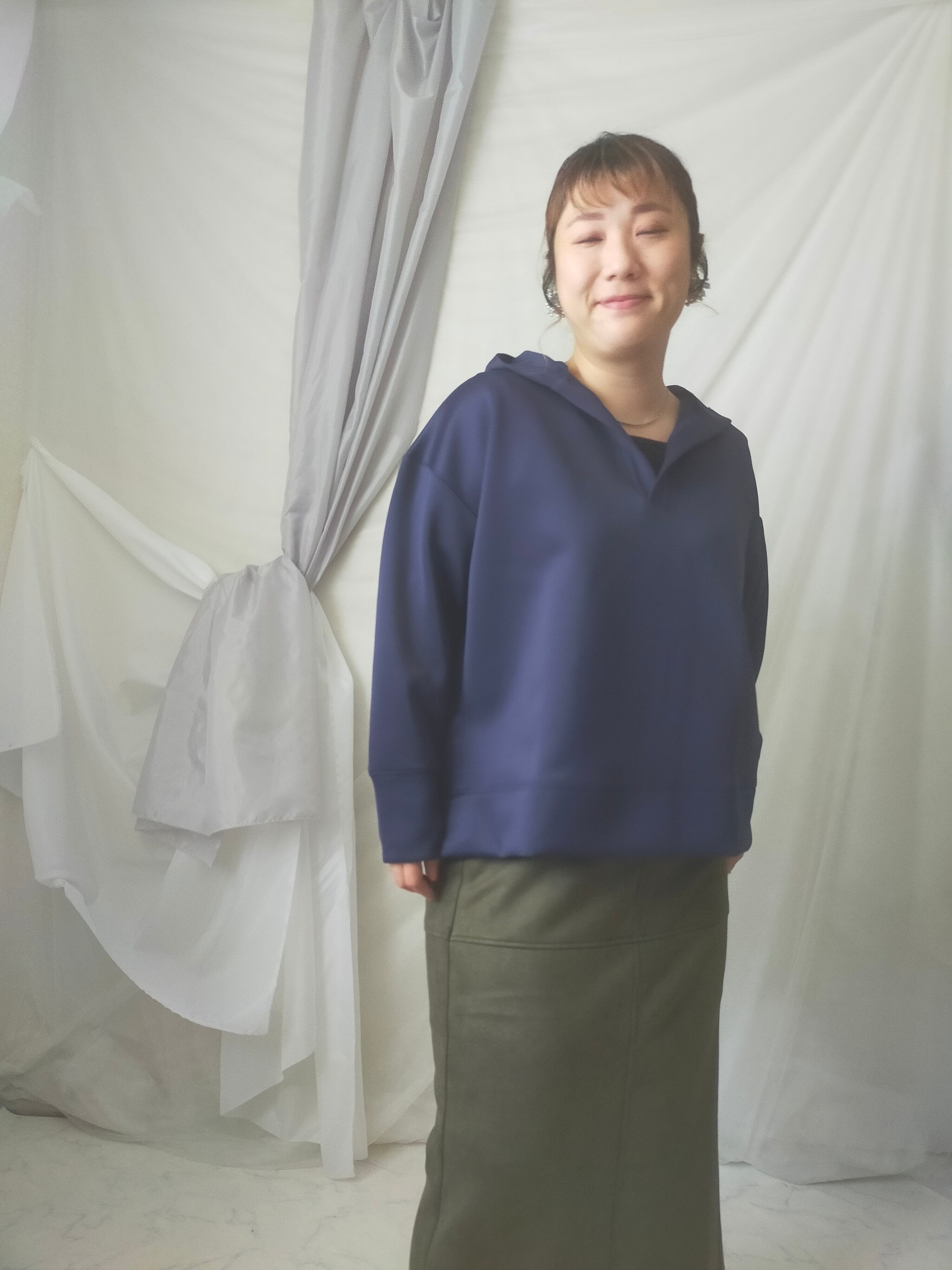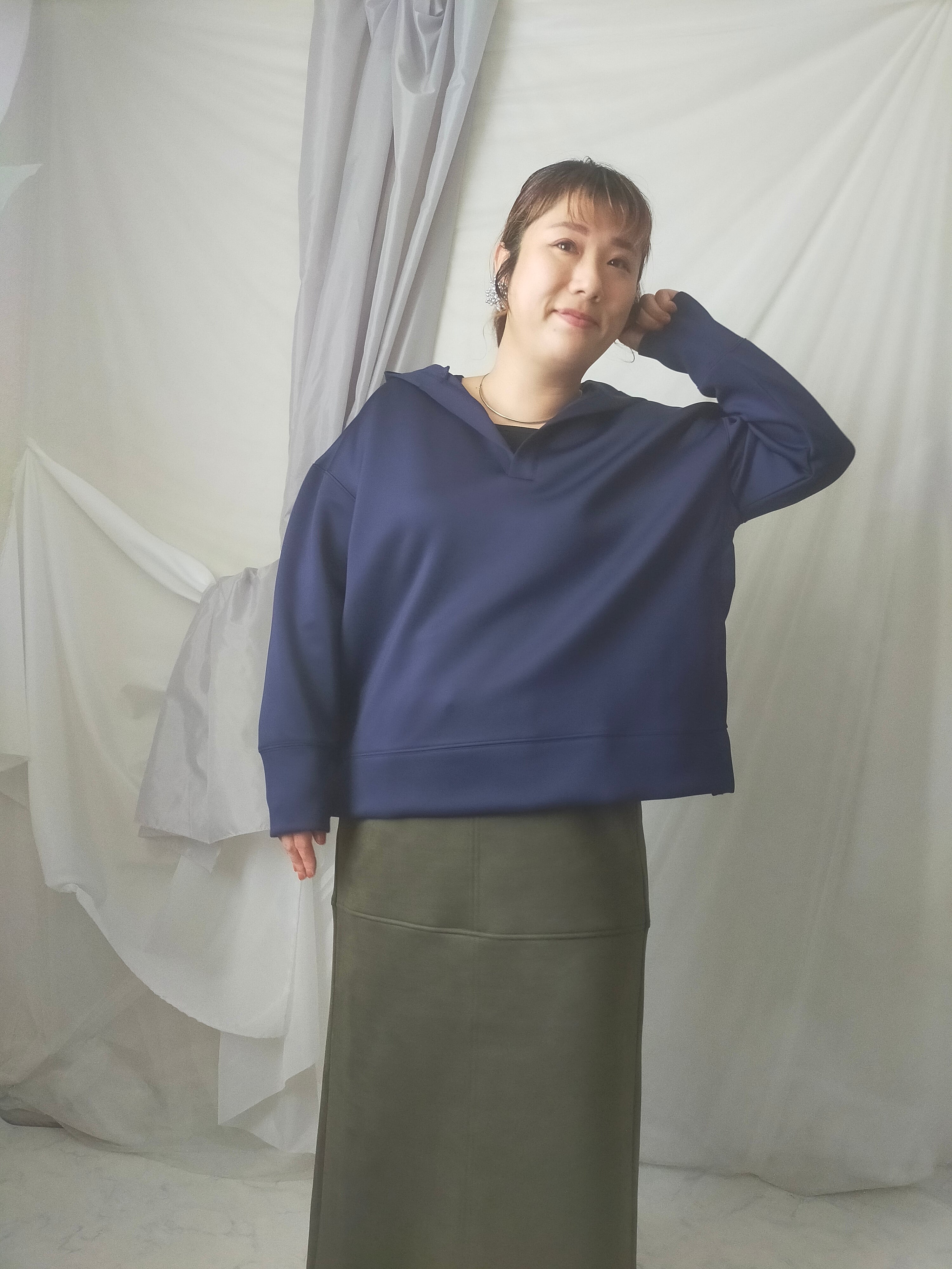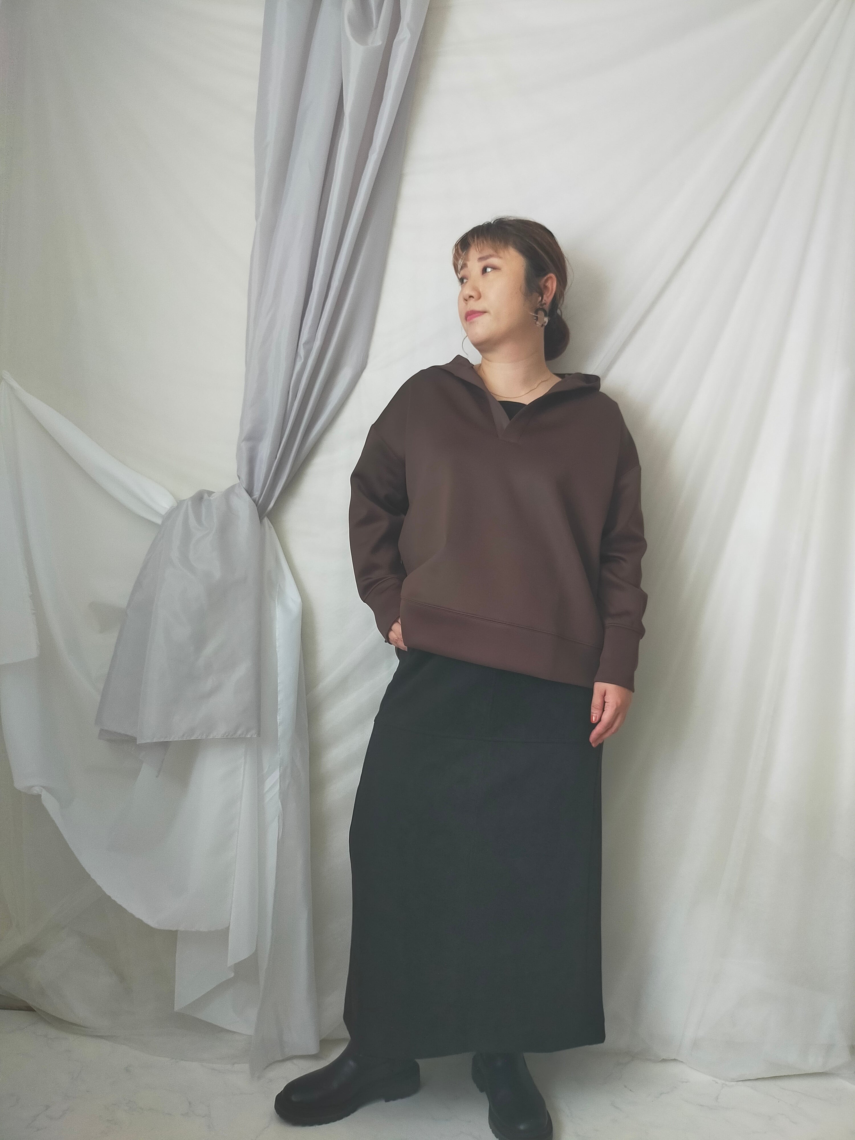 首周りすっきりさせたい派の方にオススメのプルパーカー!身幅ワイドでゆったりしています。ツルっとした生地なのでカジュアルすぎず着用できます。