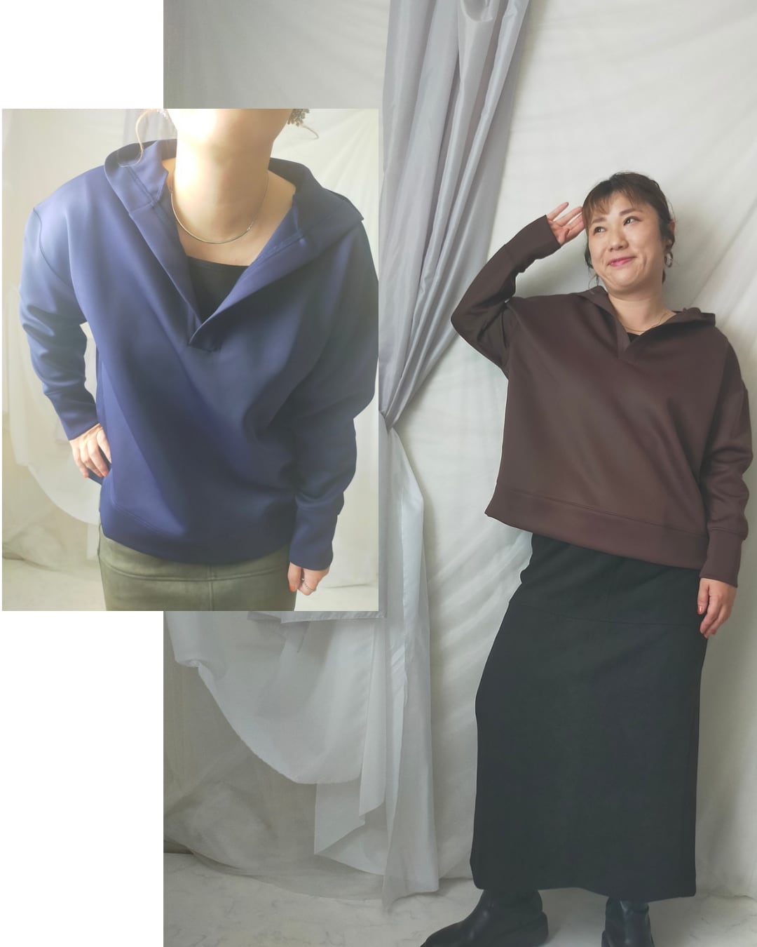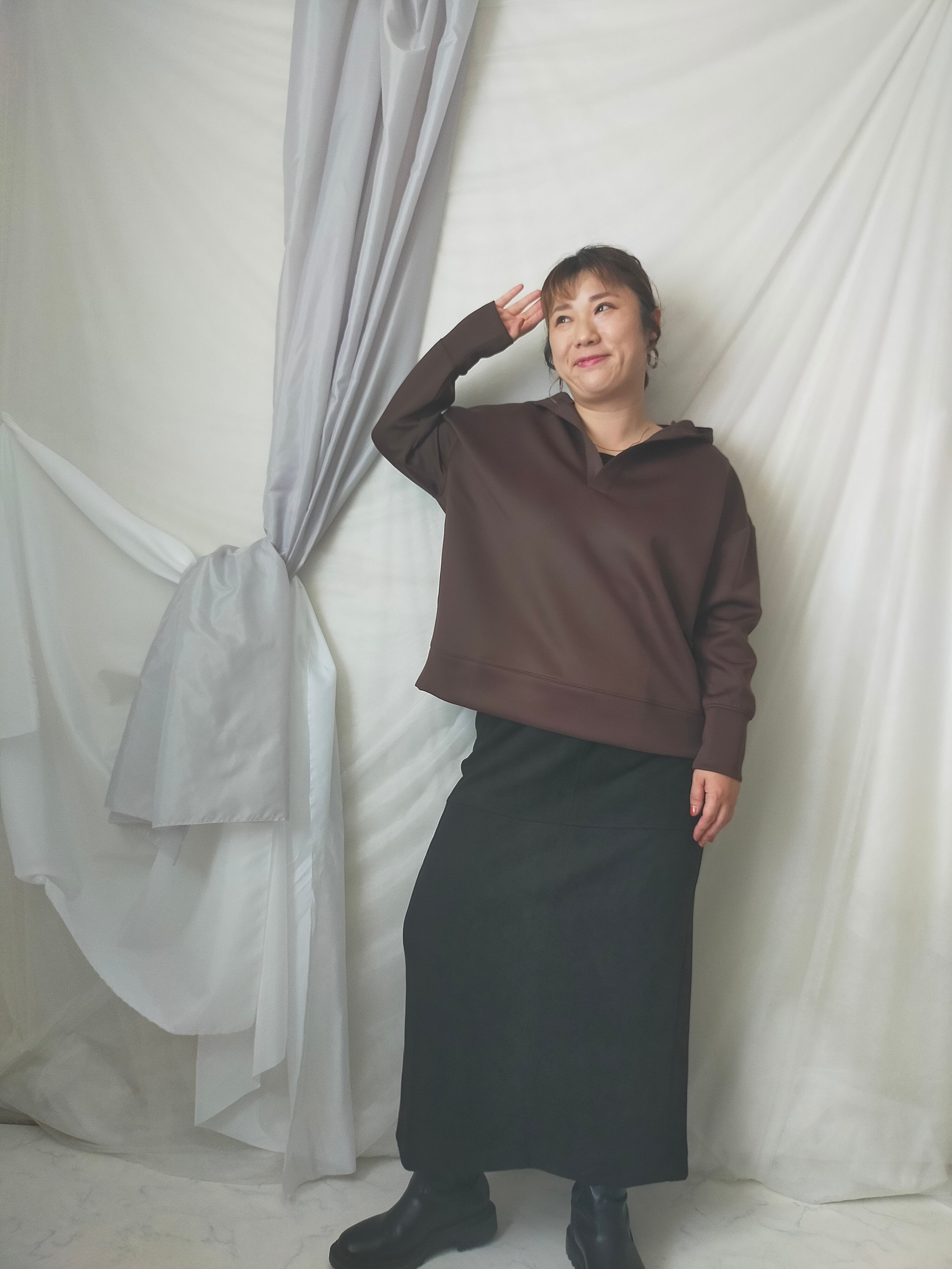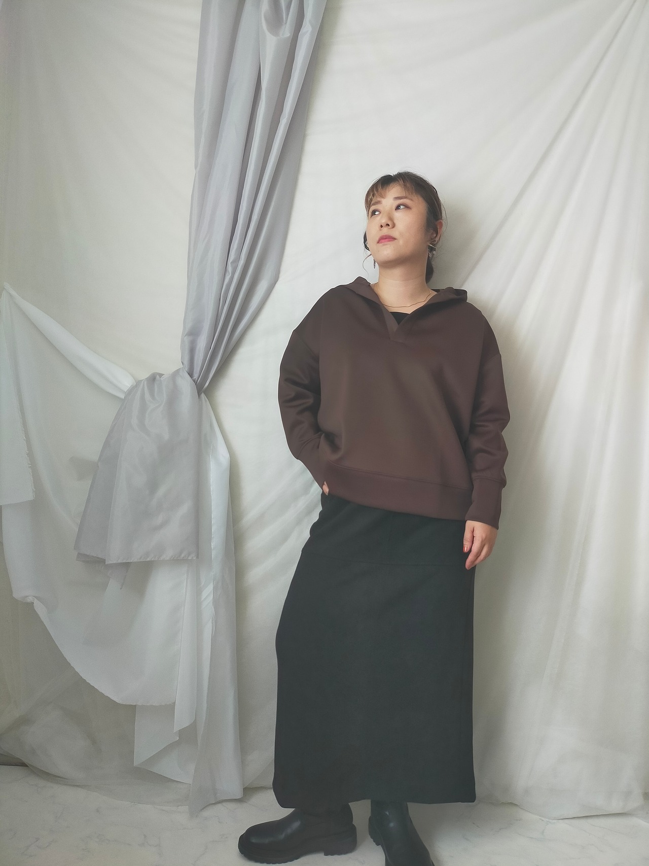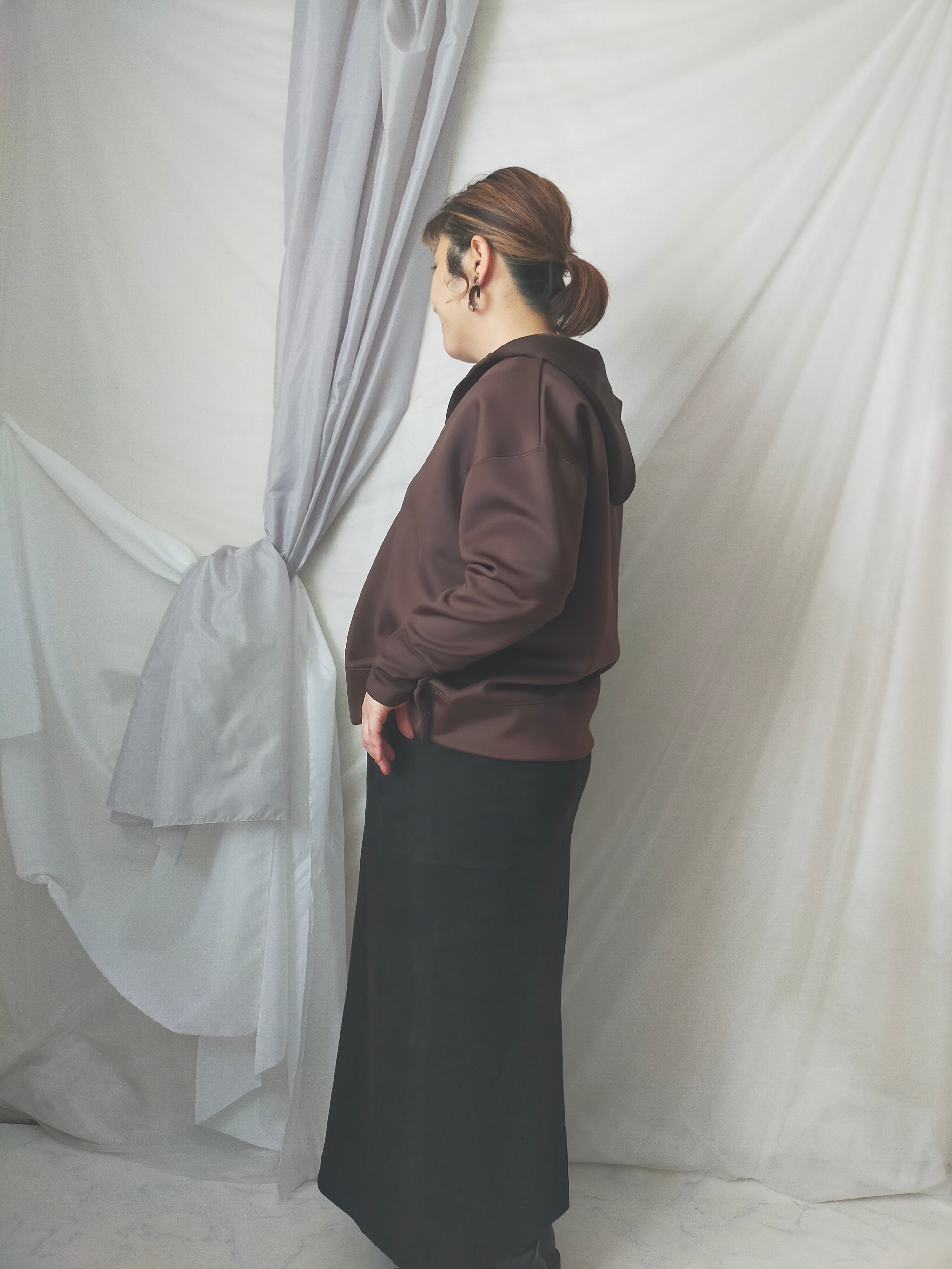 首周りすっきりさせたい派の方にオススメのプルパーカー!身幅ワイドでゆったりしています。ツルっとした生地なのでカジュアルすぎず着用できます。