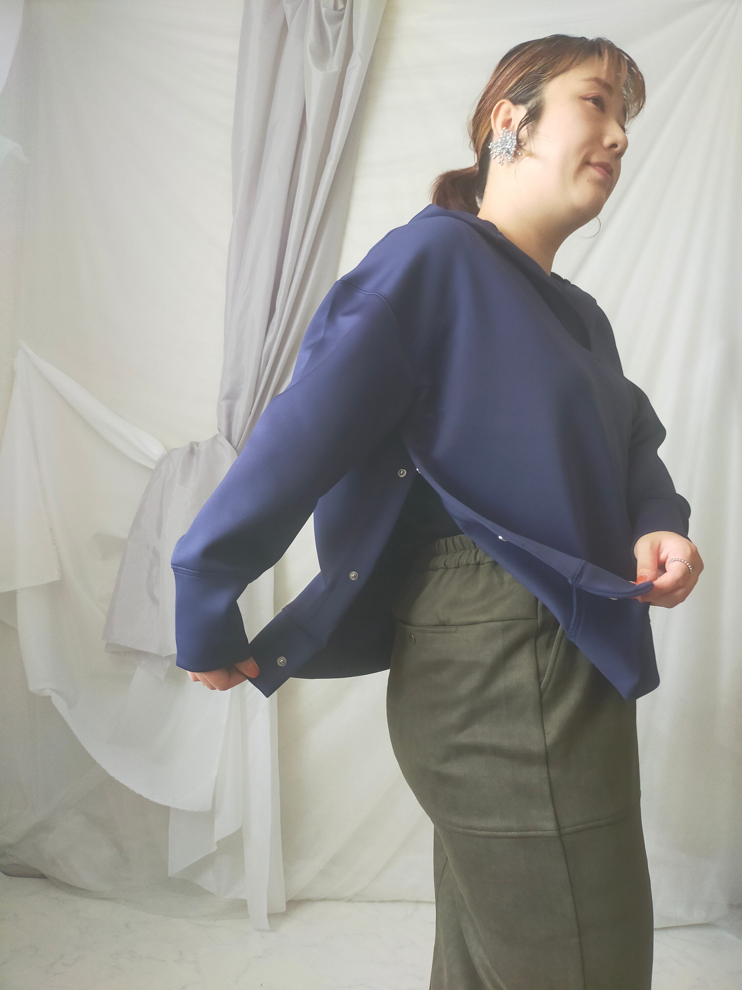 サイドのスナップボタンを開けたり閉めたりで雰囲気変えられます。