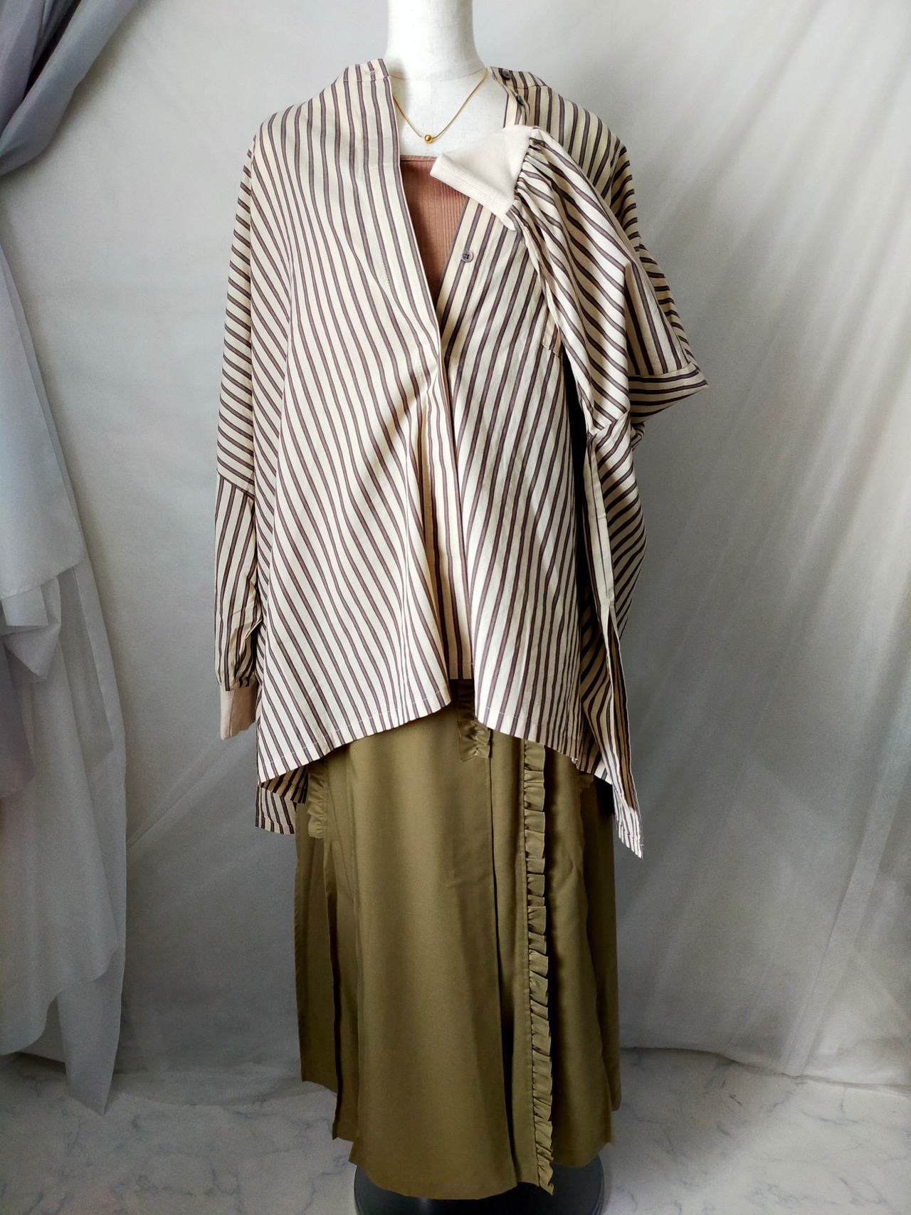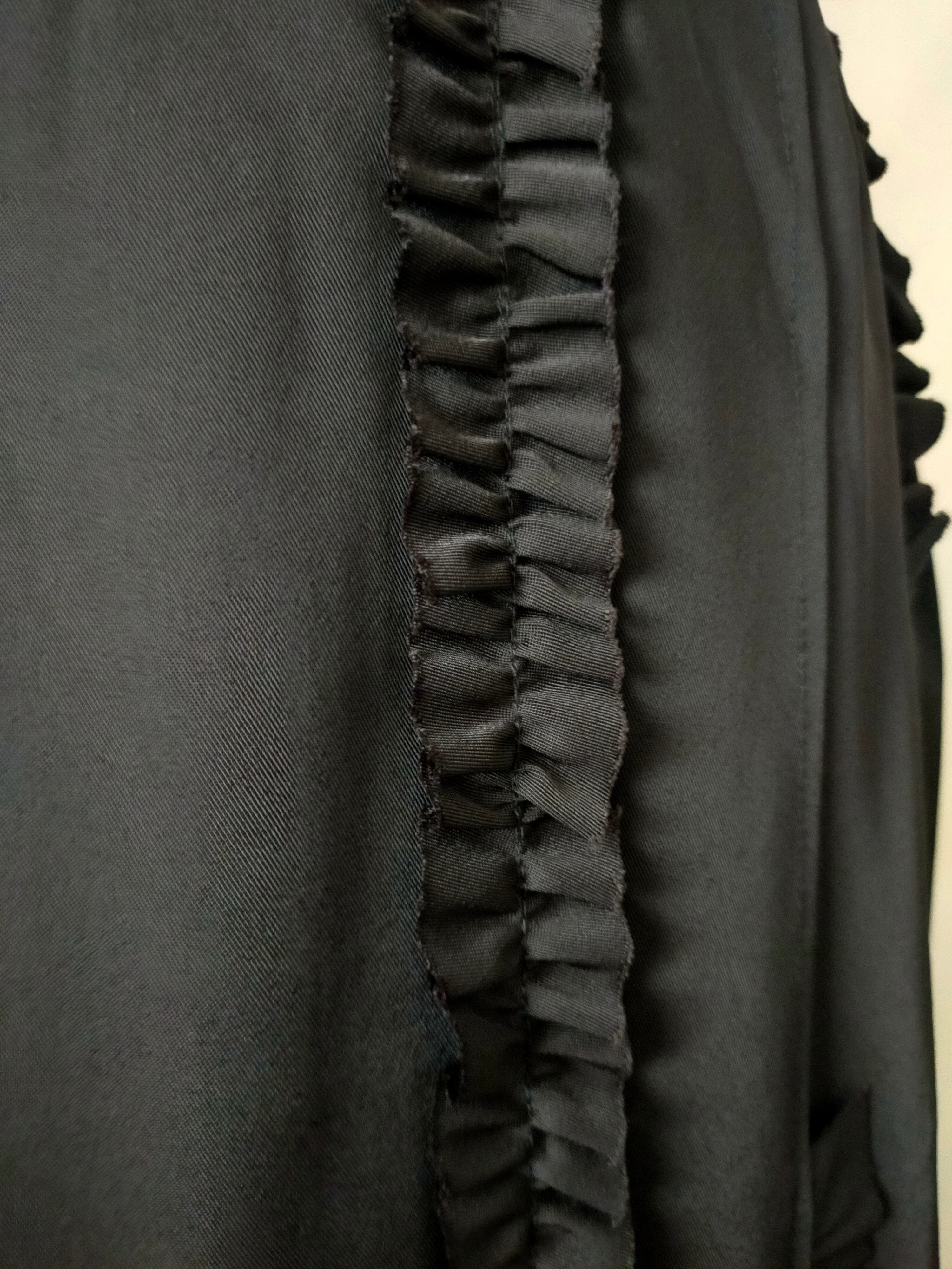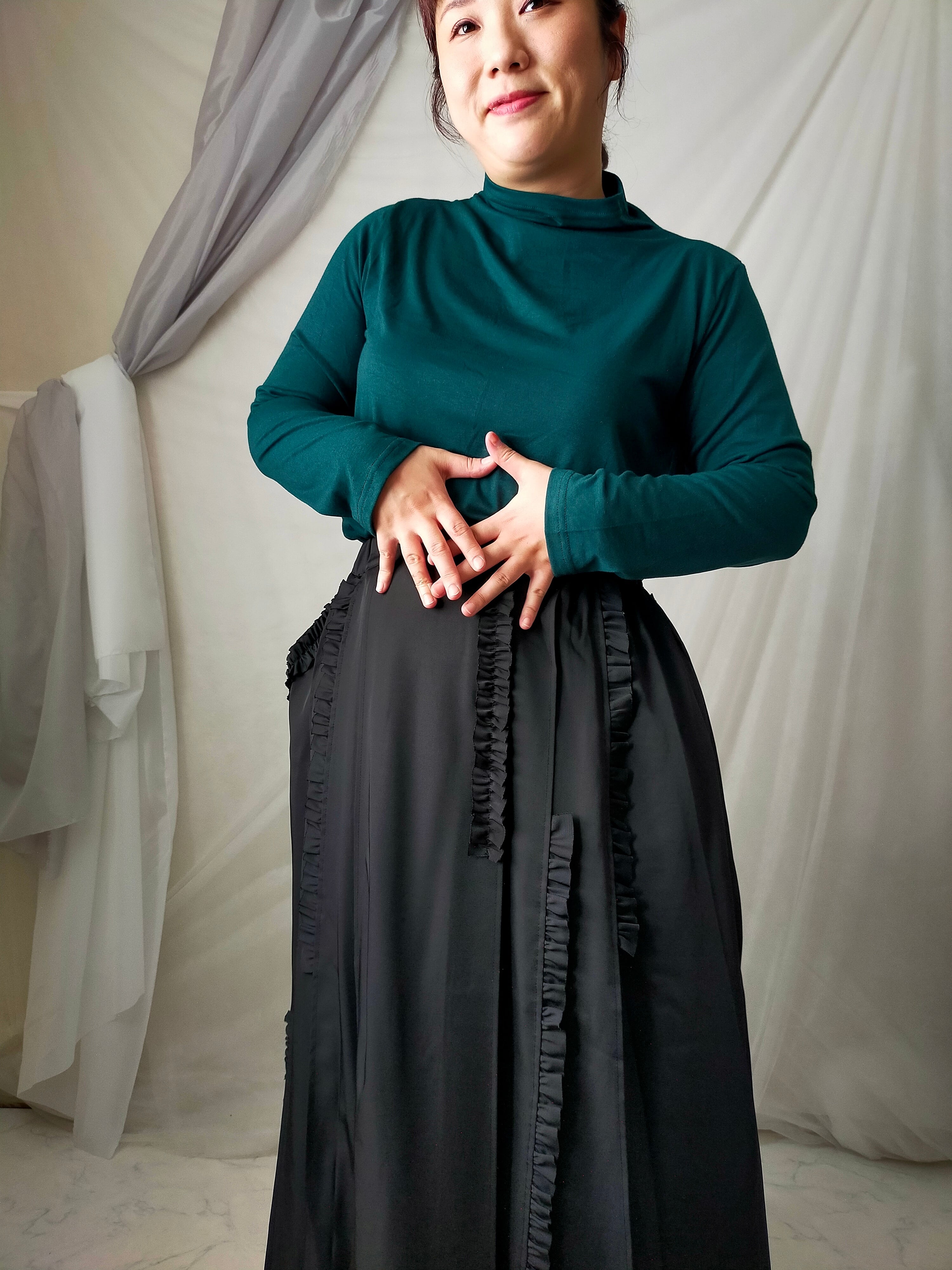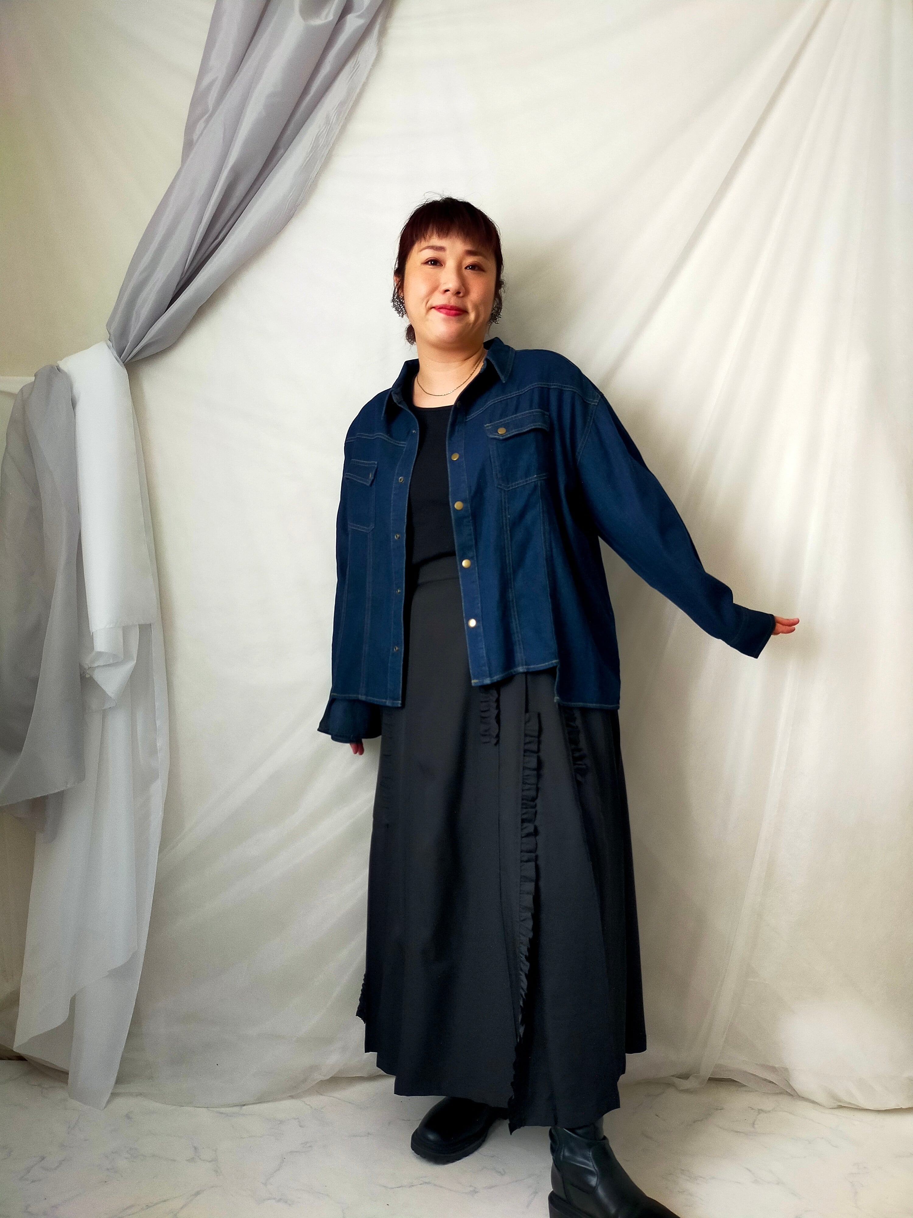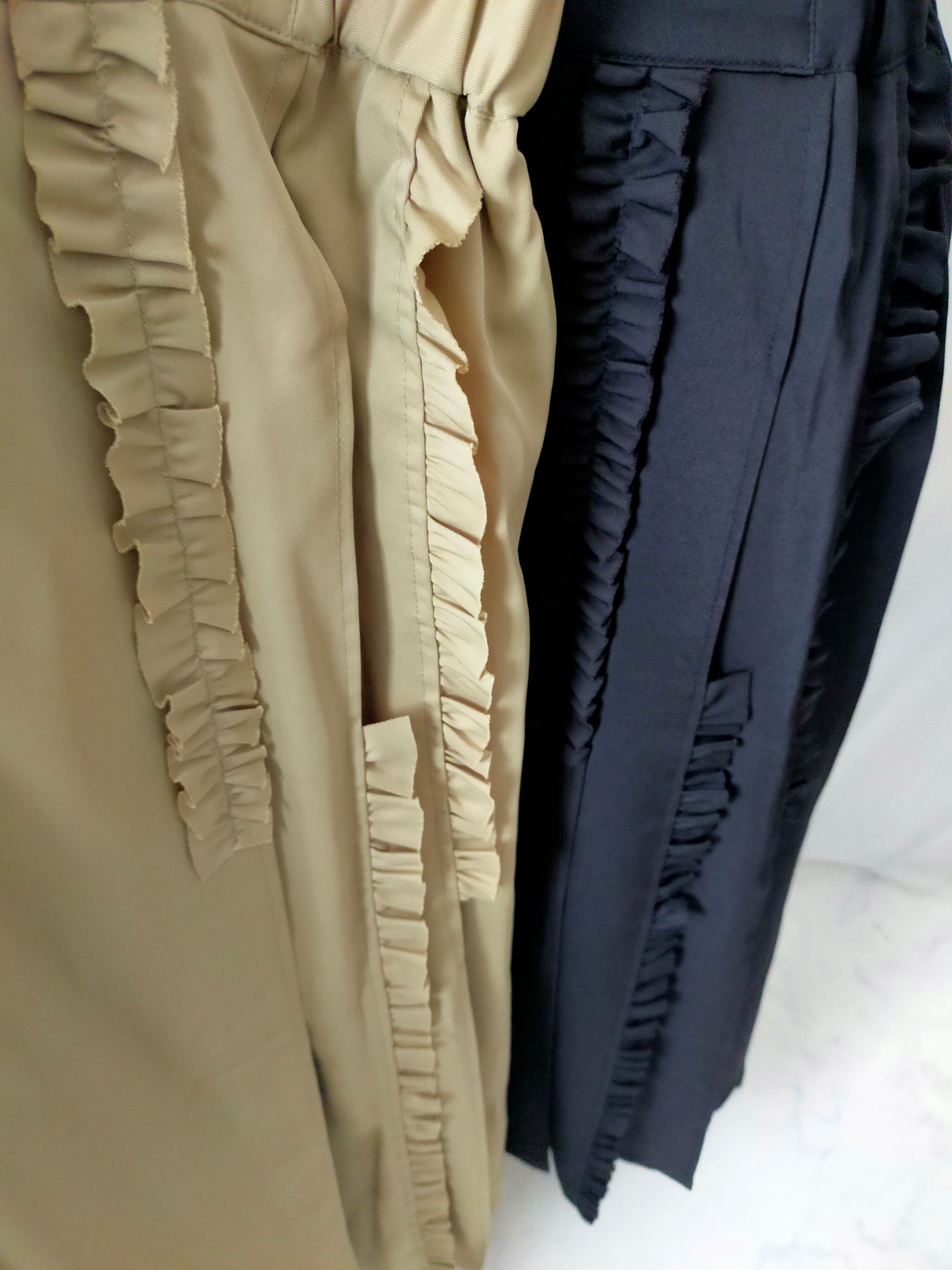フリル端は裁ち切りで軽い印象に仕上げました。タック部分はステッチ入りで、取れることなく着用できます。