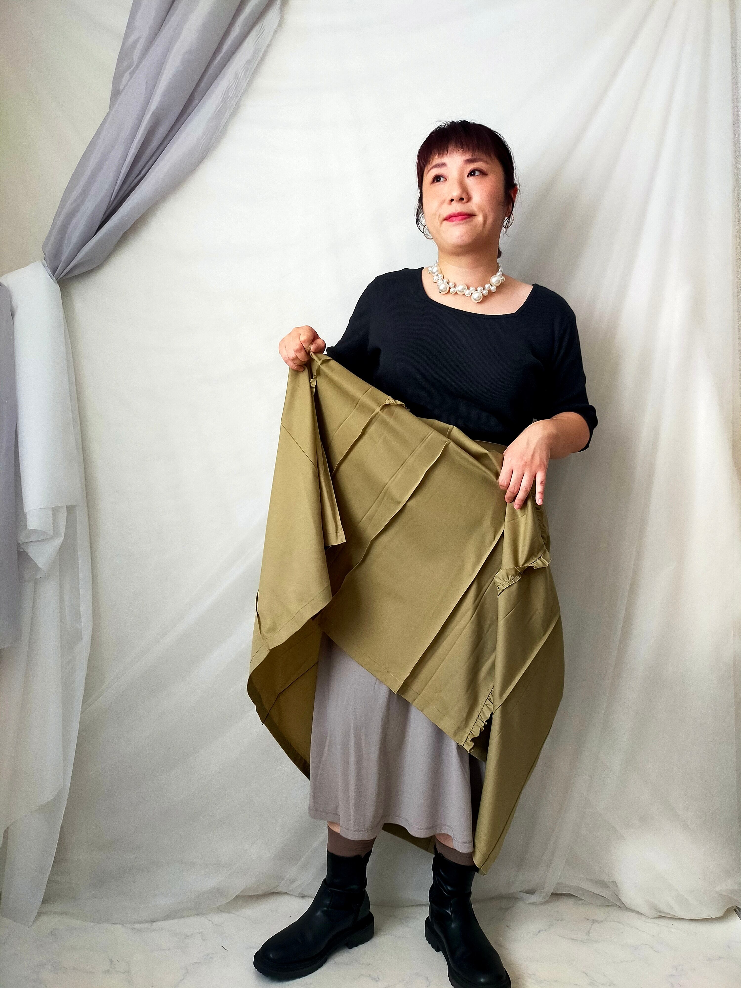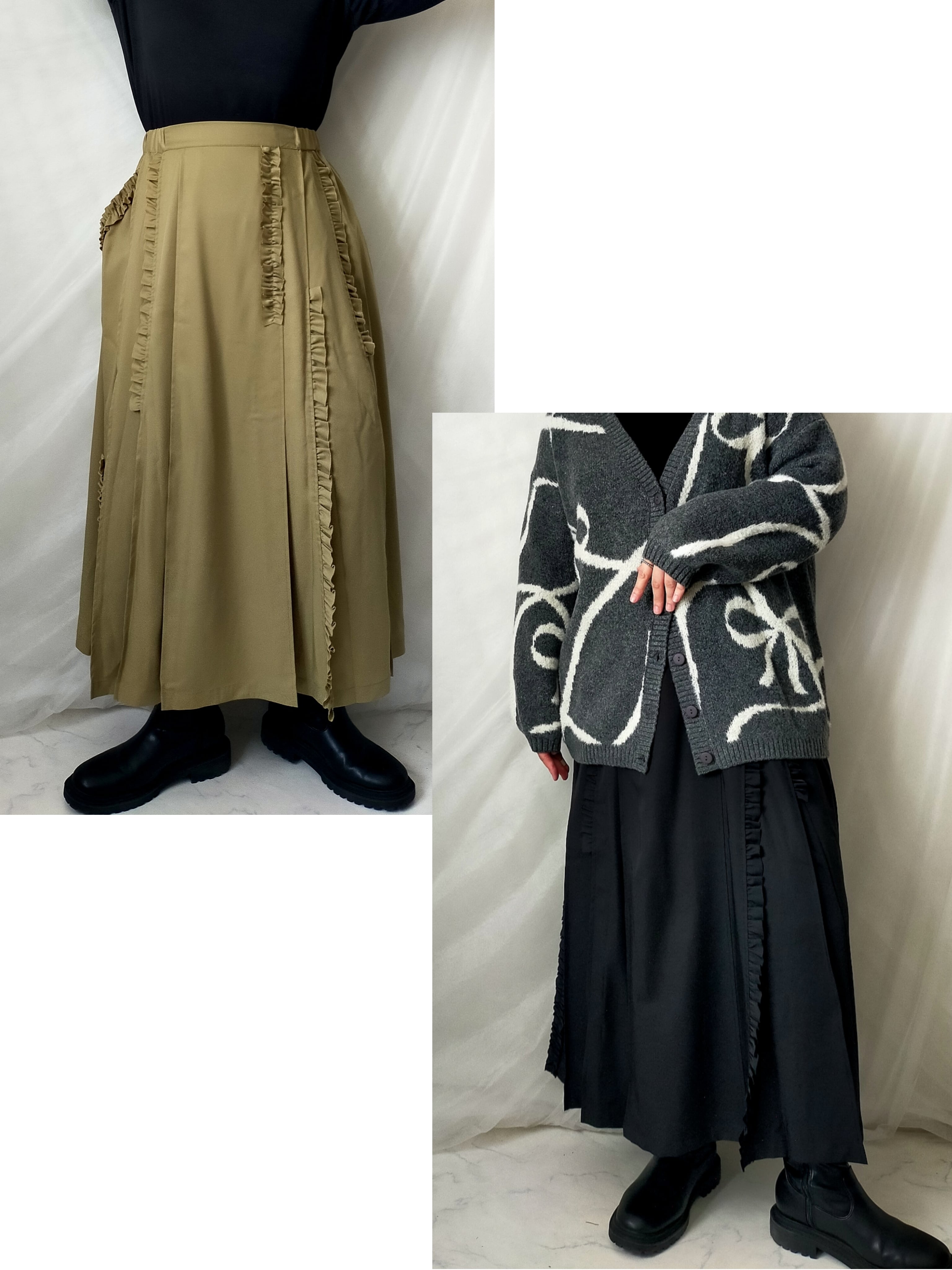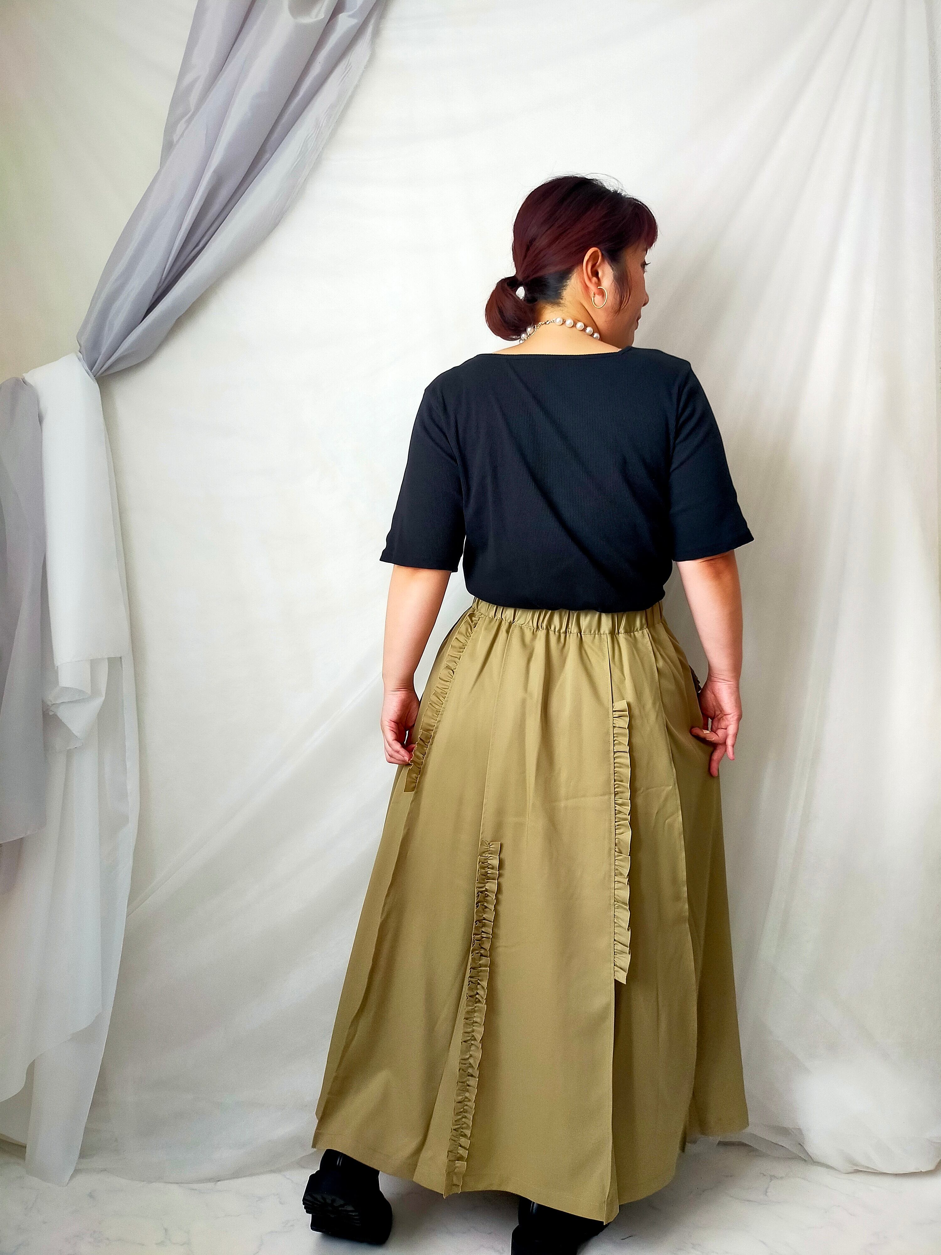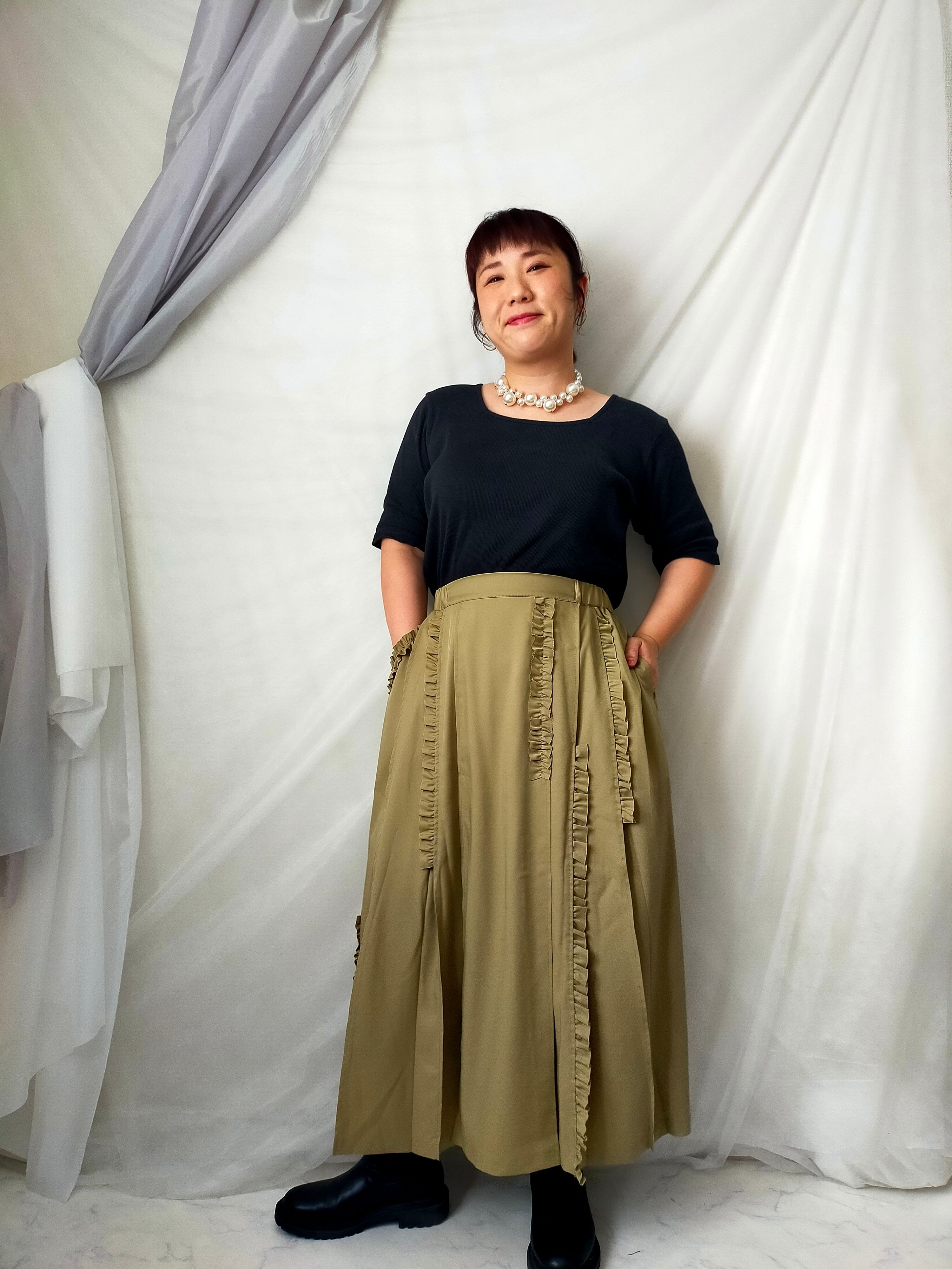 アシメにつけた縦フリルが程良い甘さをプラスするタックプリーツスカート。すっきりとしたシルエットと微光沢の生地で上品な印象に。右はフリルをあしらったポケット、左は普通のポケットでアシンメトリーなデザインになっています。