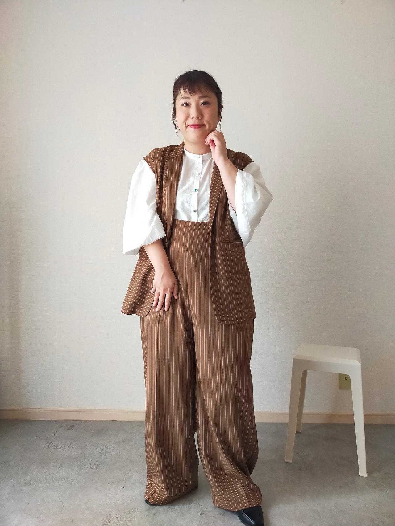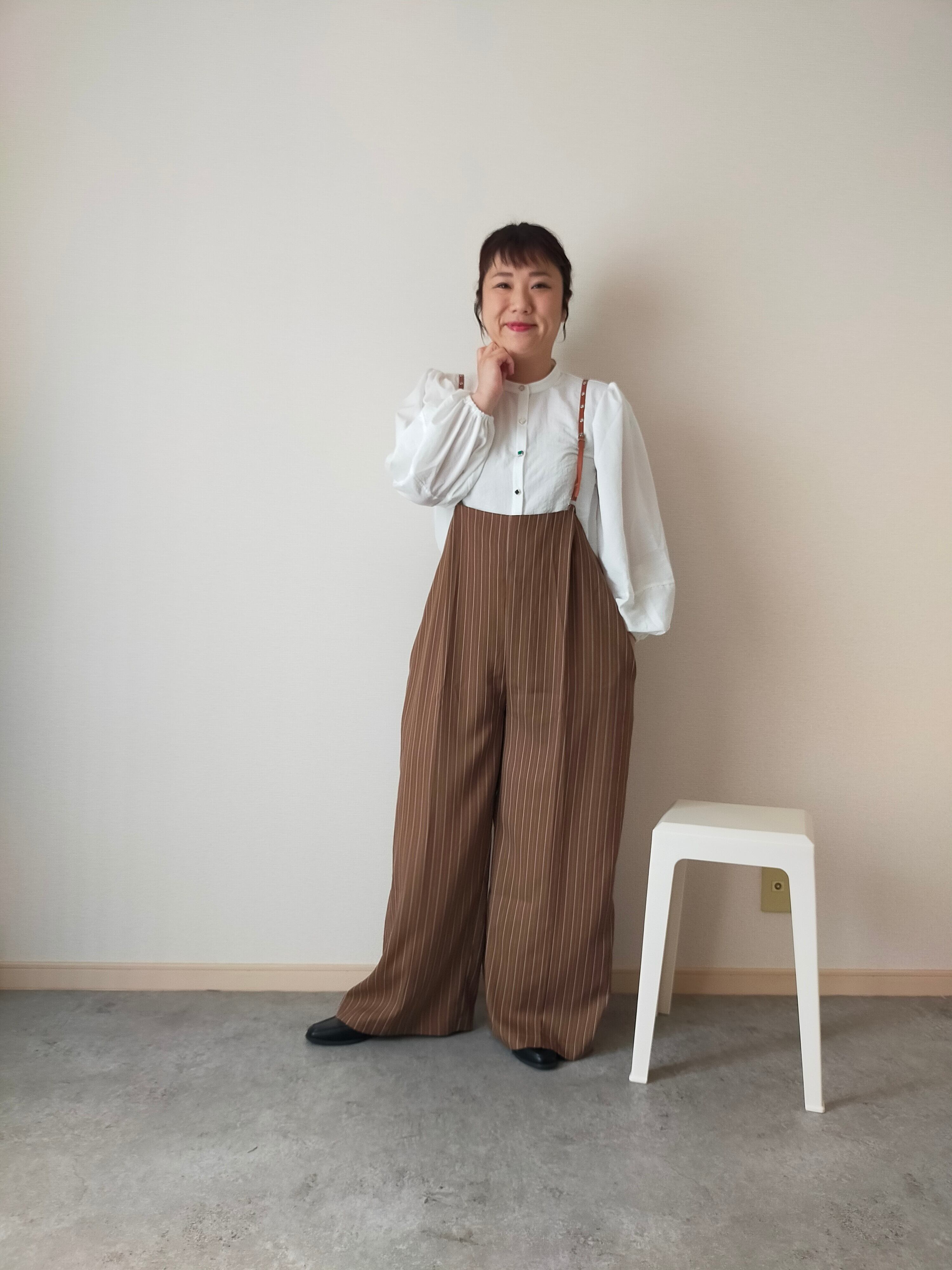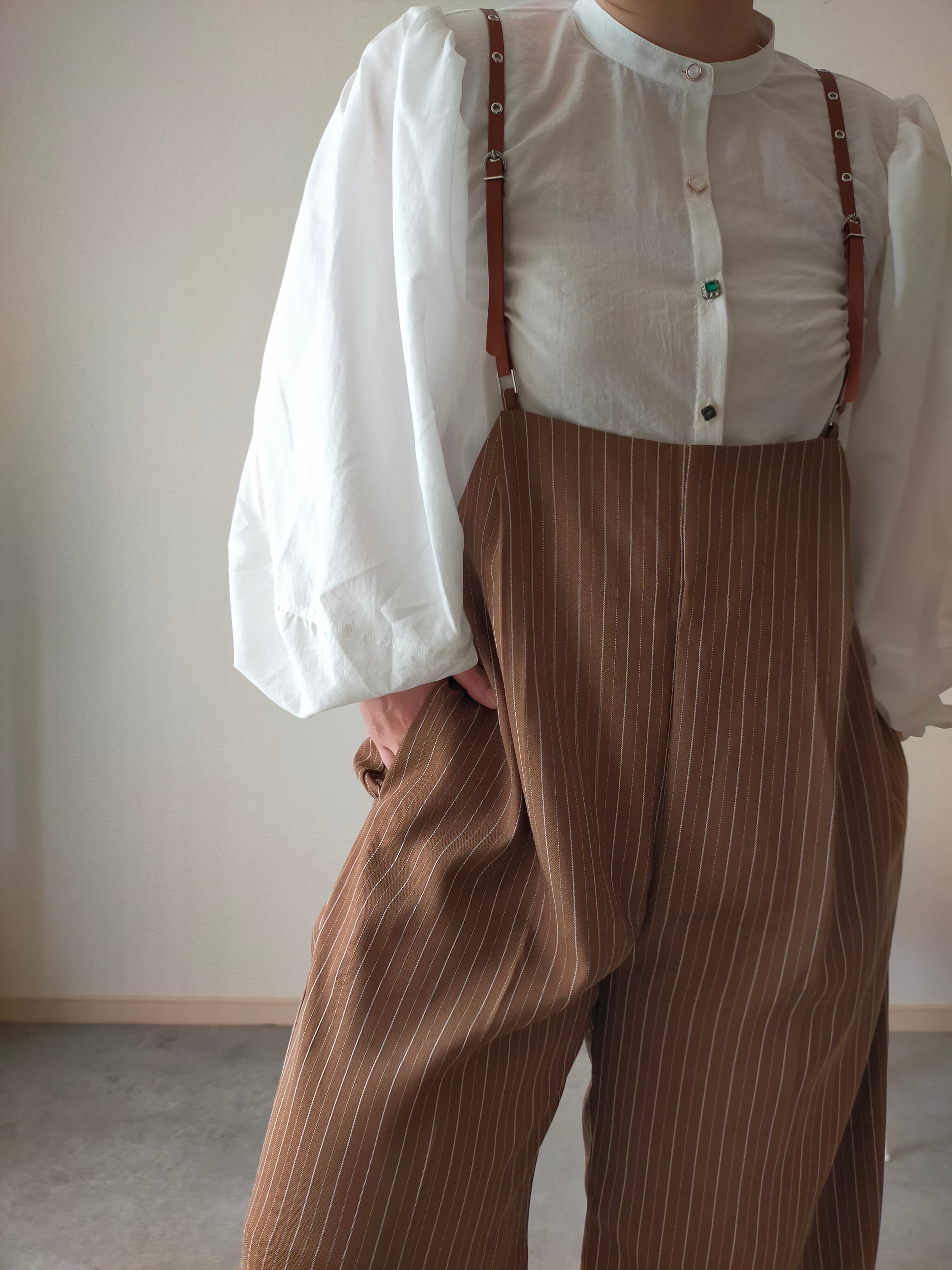 ヘリンボーンのストライプ素材が上品なサス付パンツ。