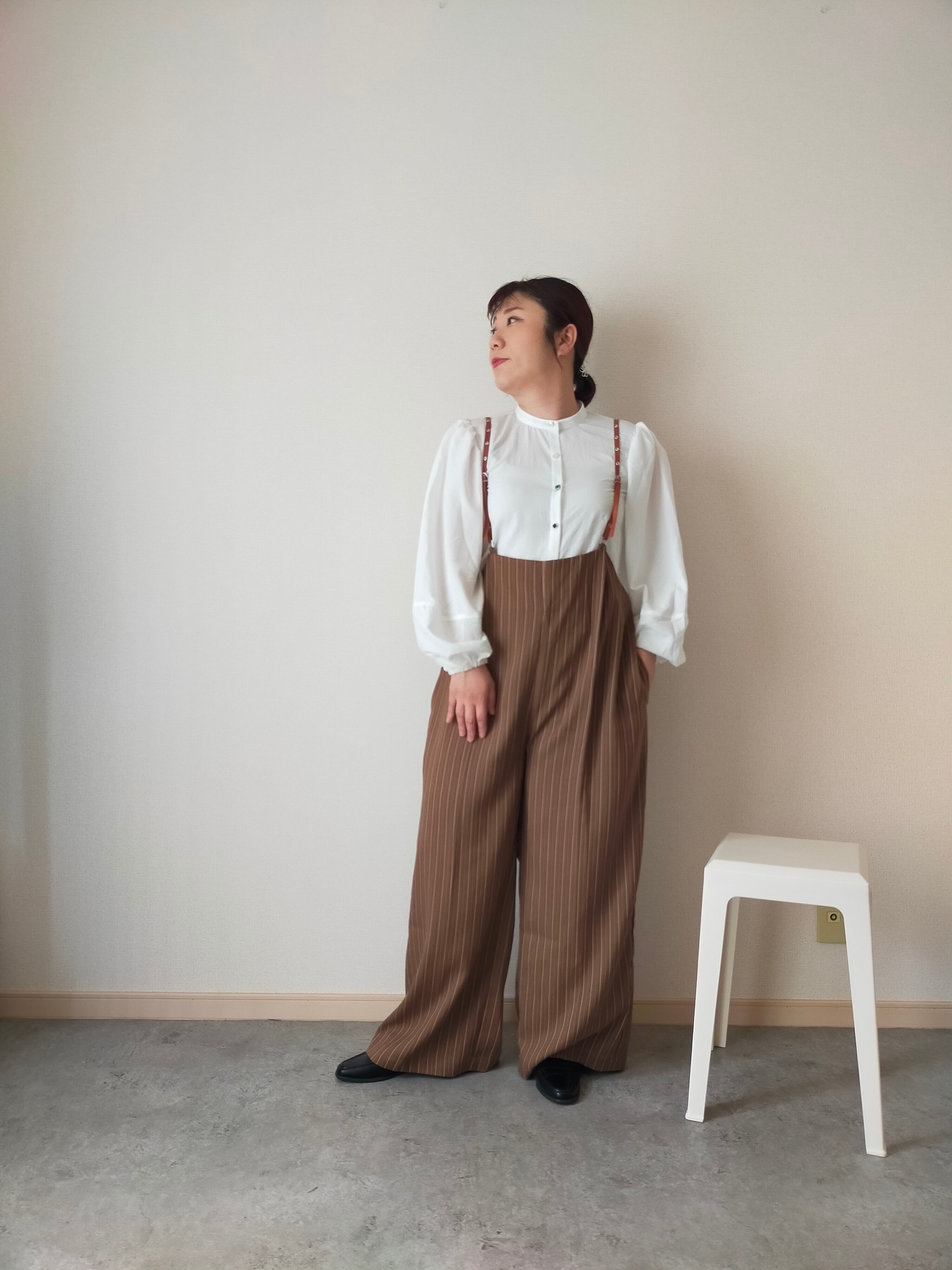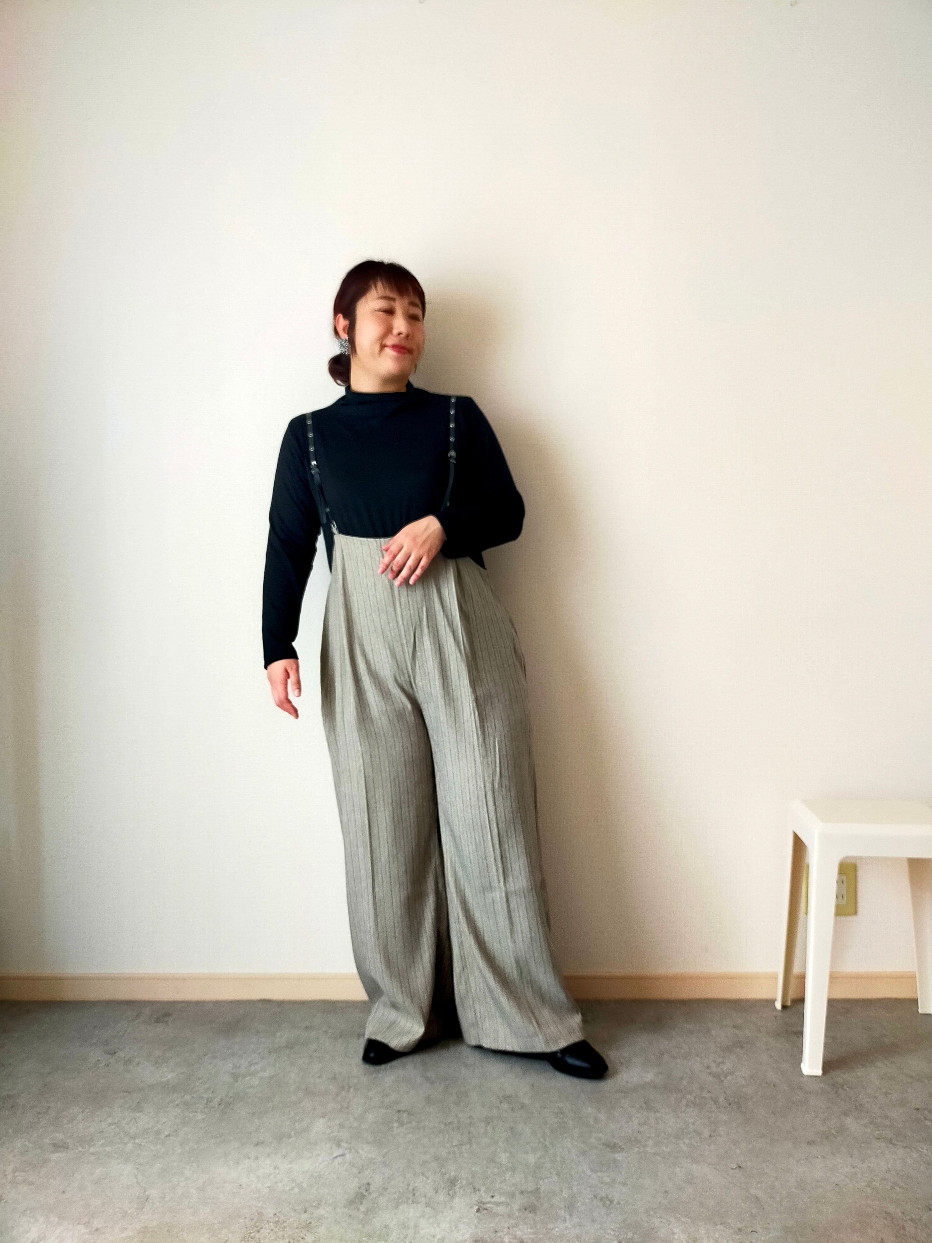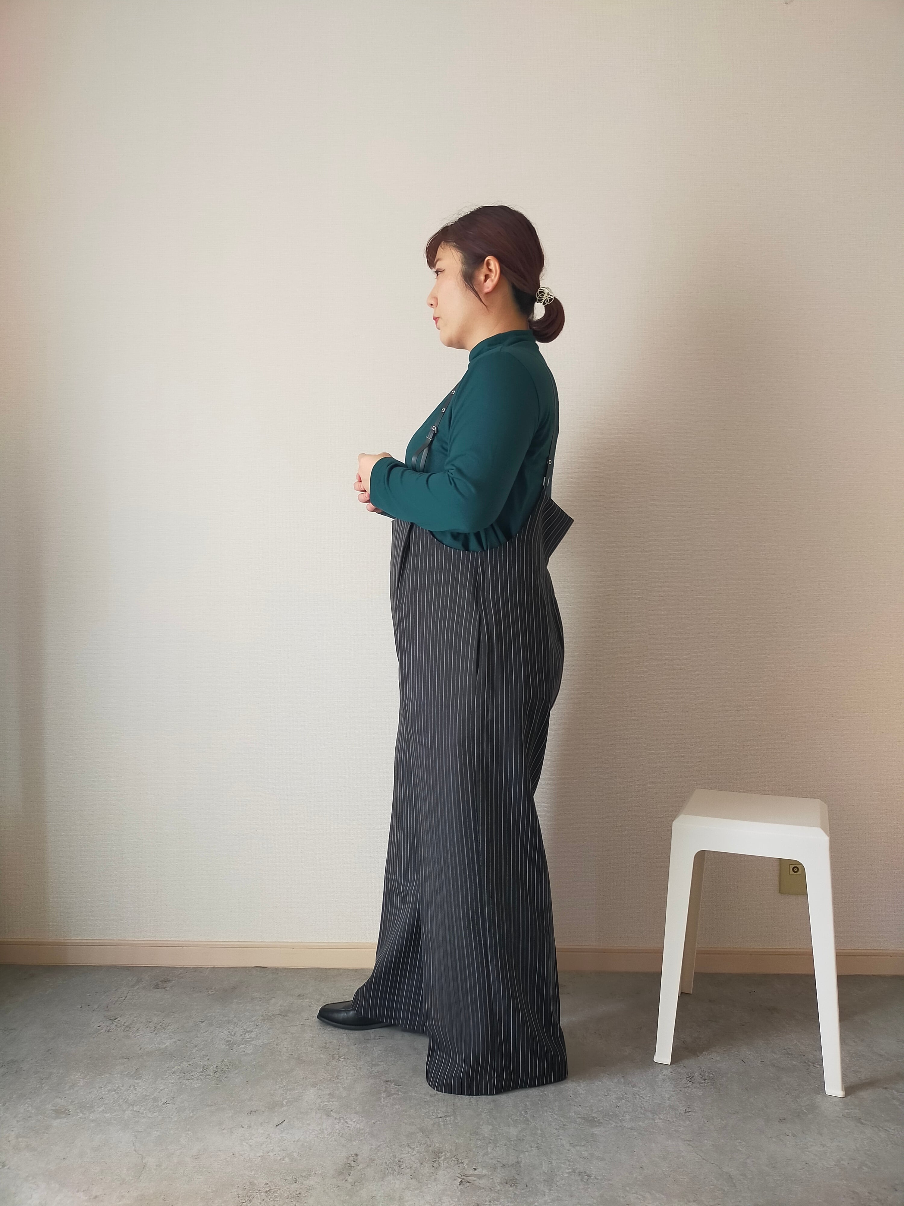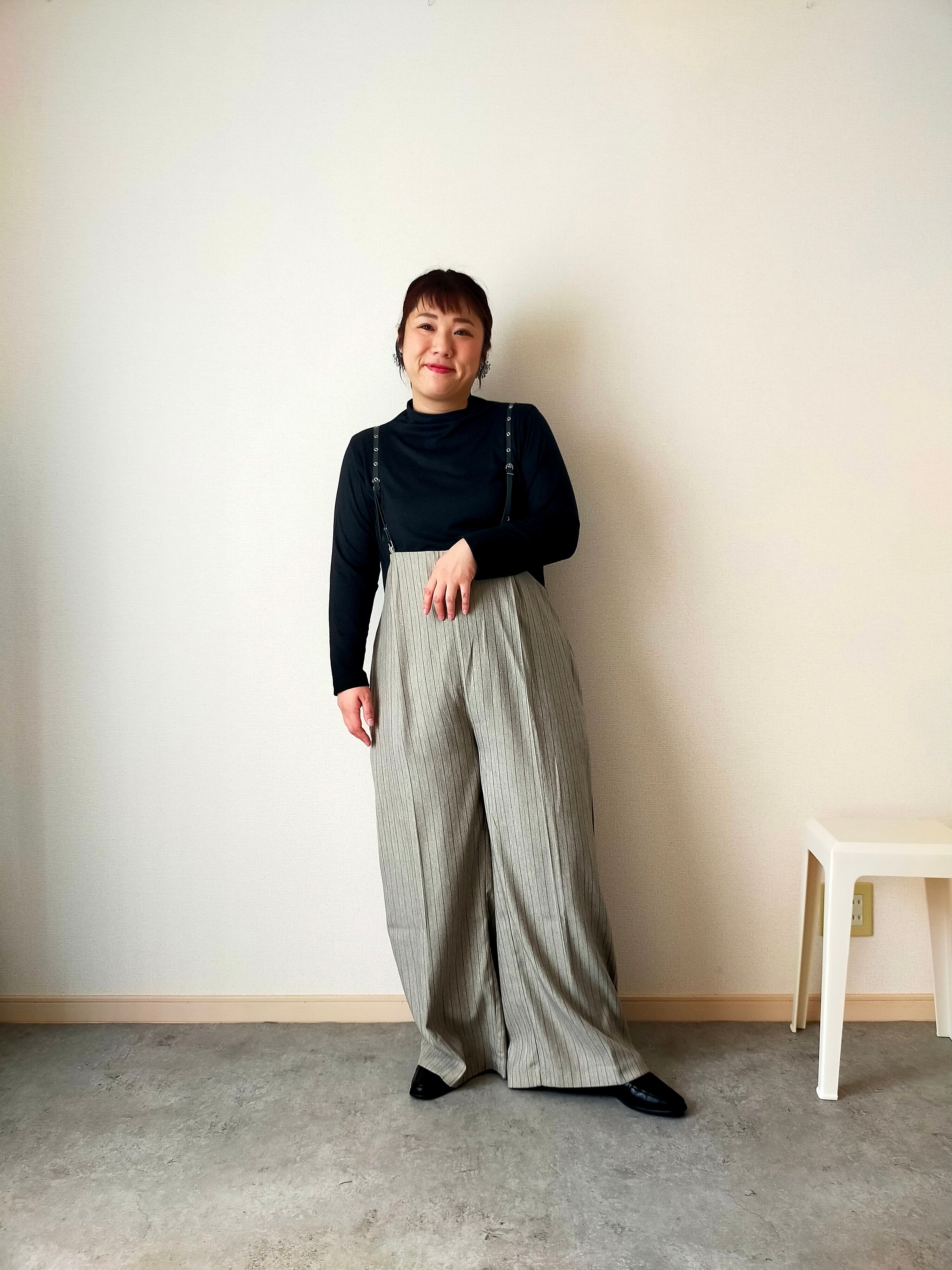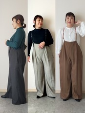 幼くなりがちなサスペンダーアイテムも、シルエットや細めの合皮の肩ひもで