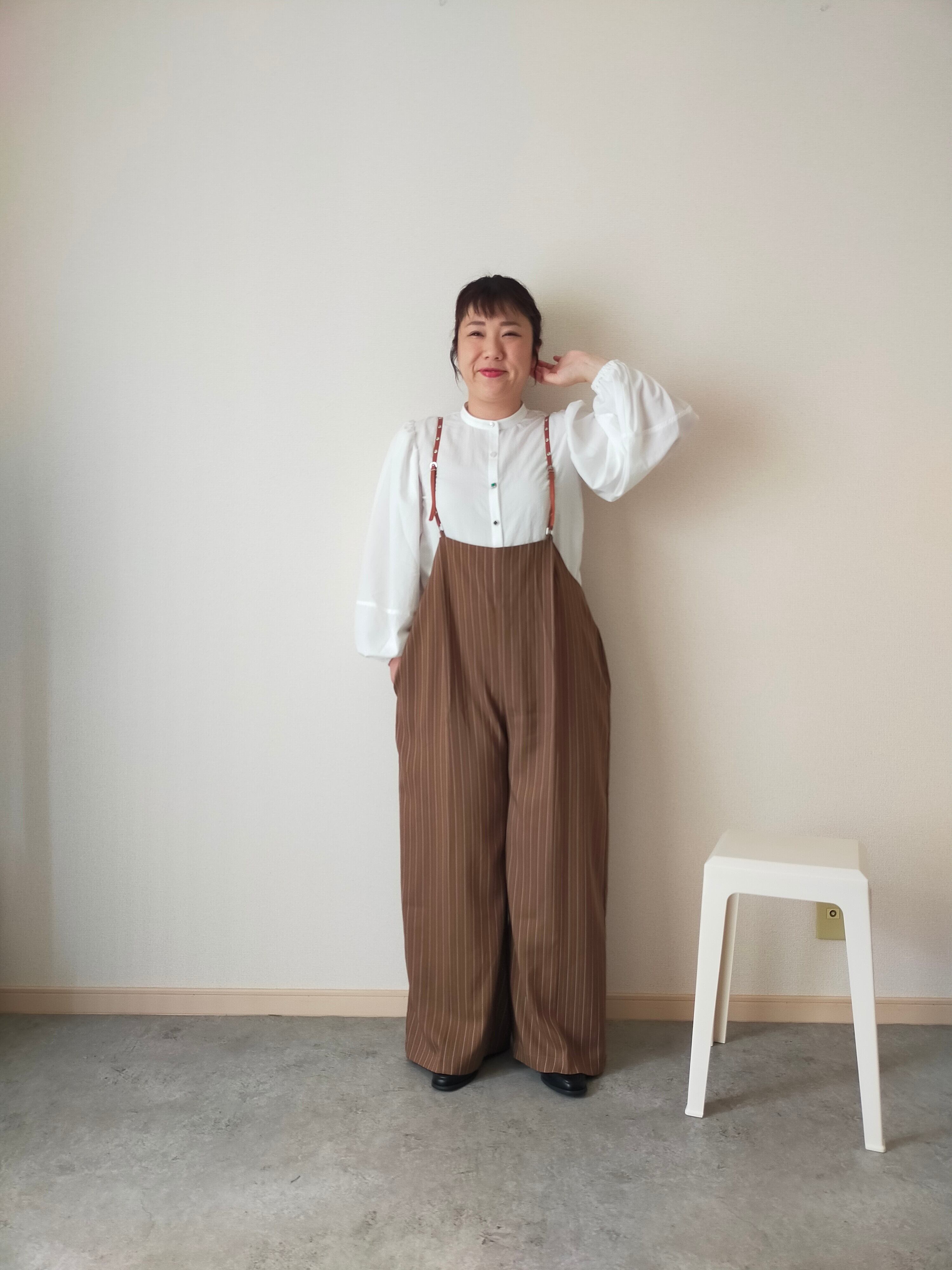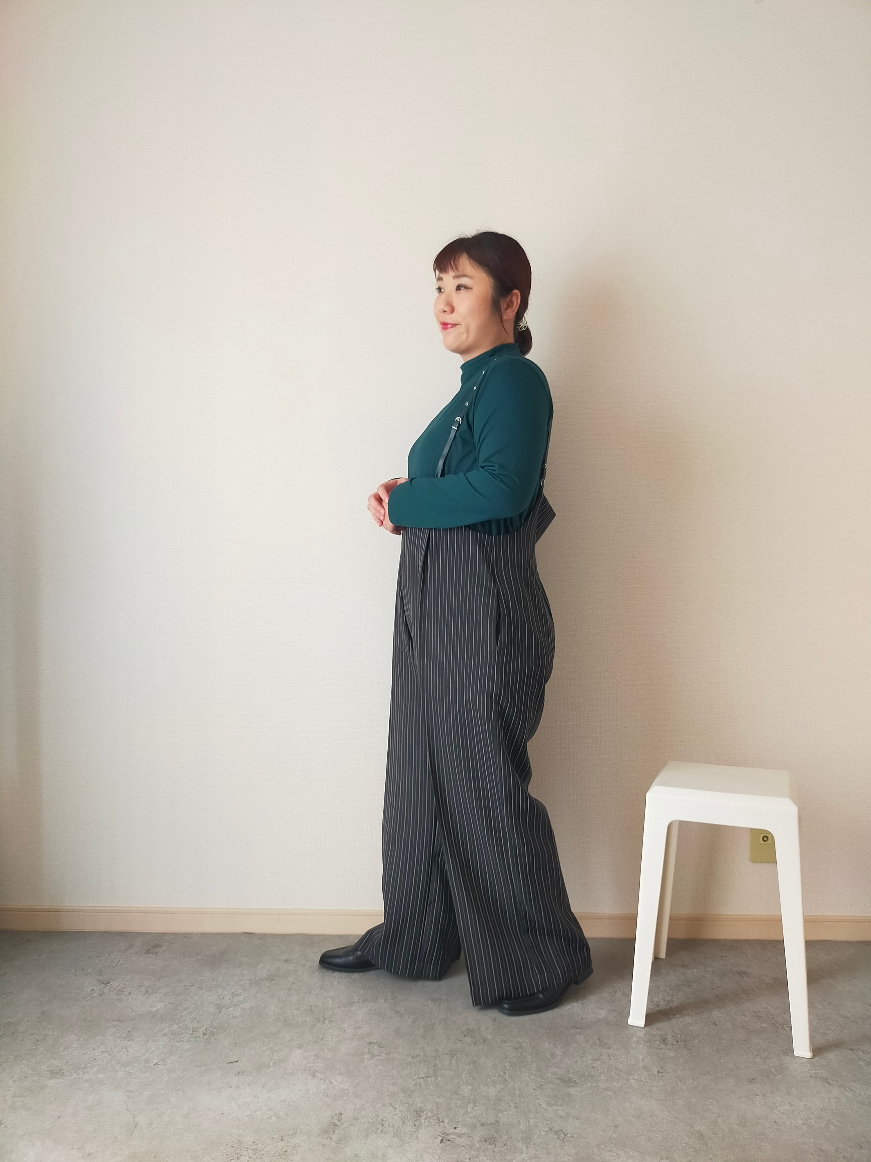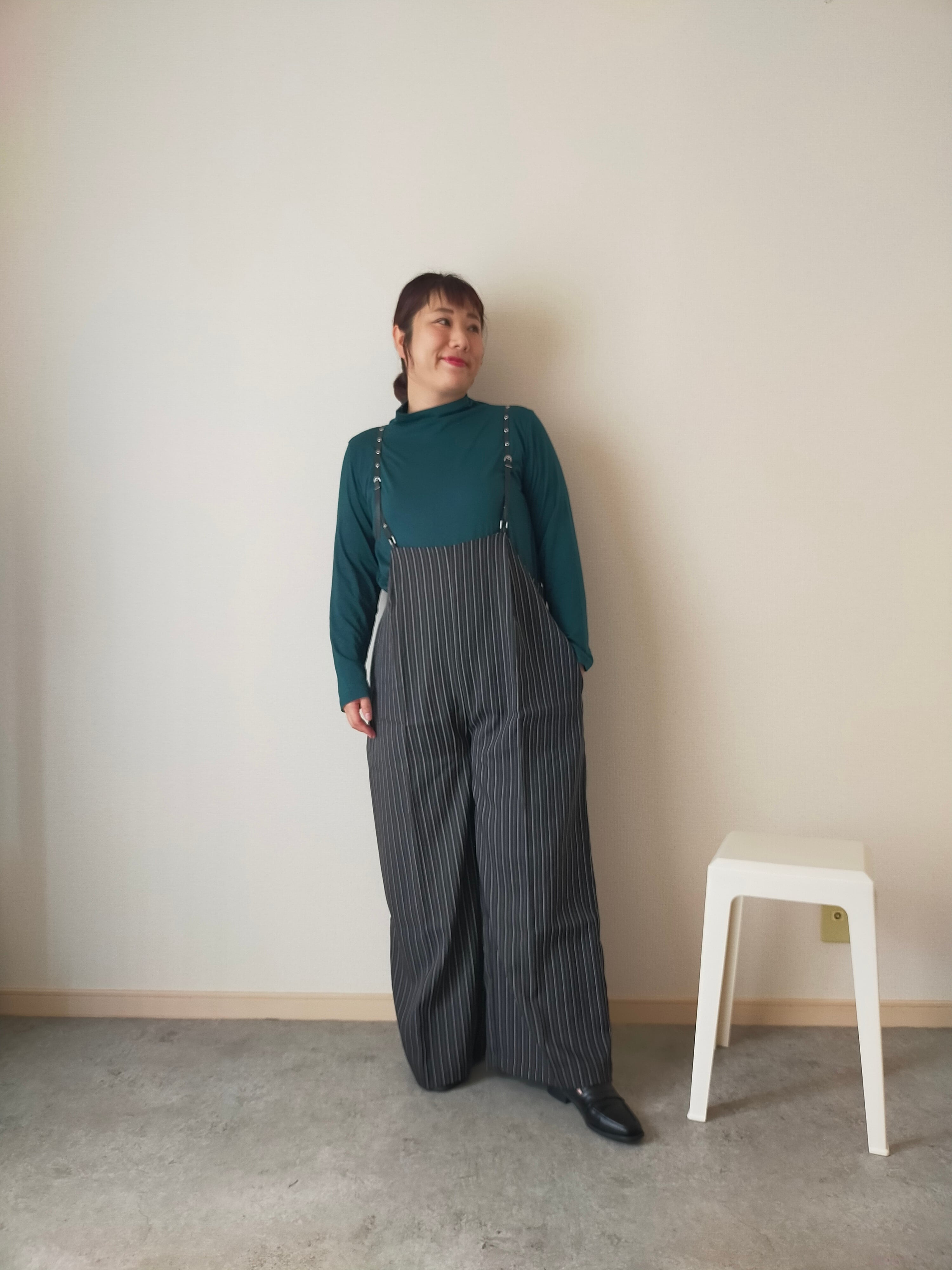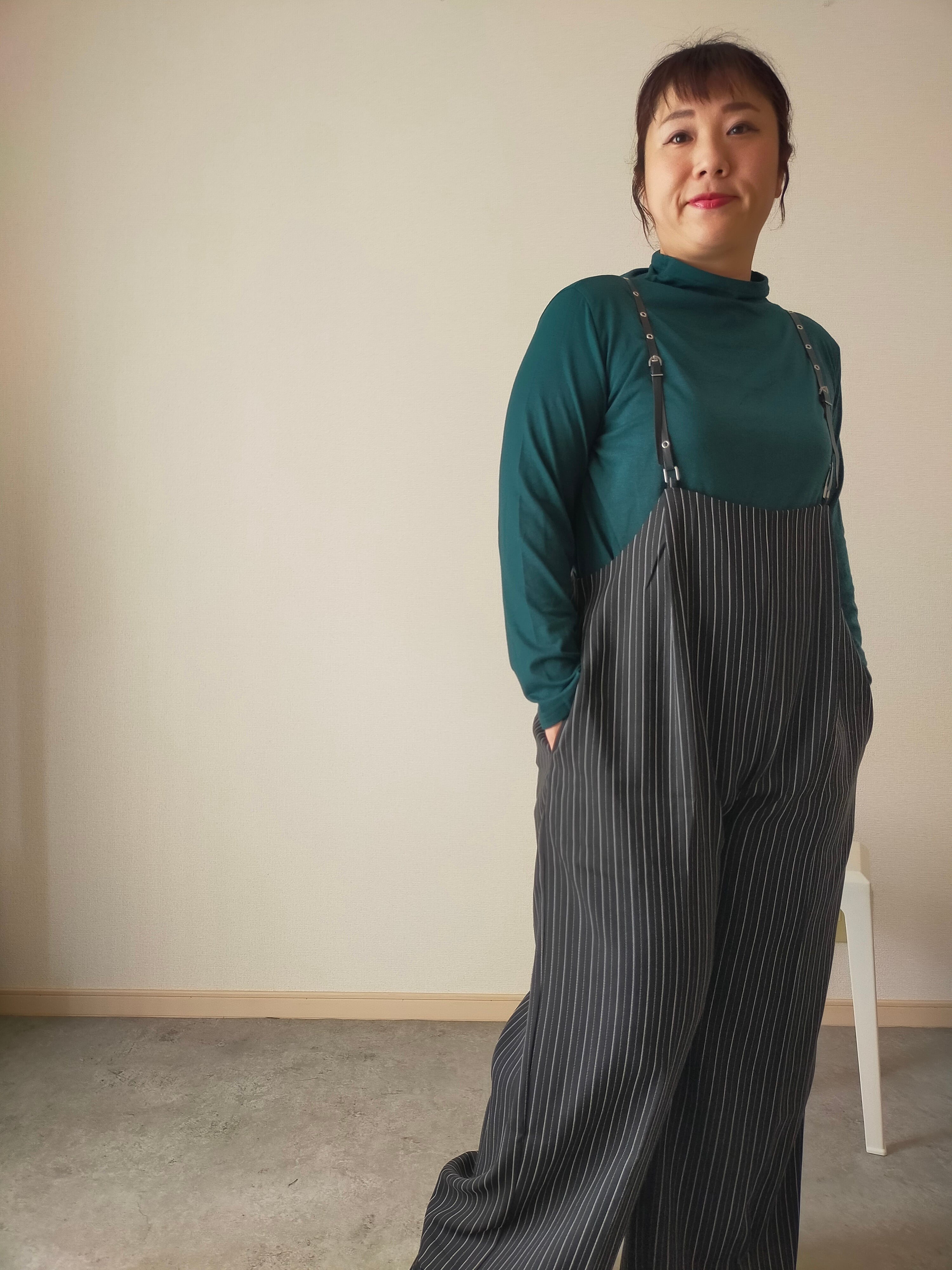 幼くなりがちなサスペンダーアイテムも、シルエットや細めの合皮の肩ひもで