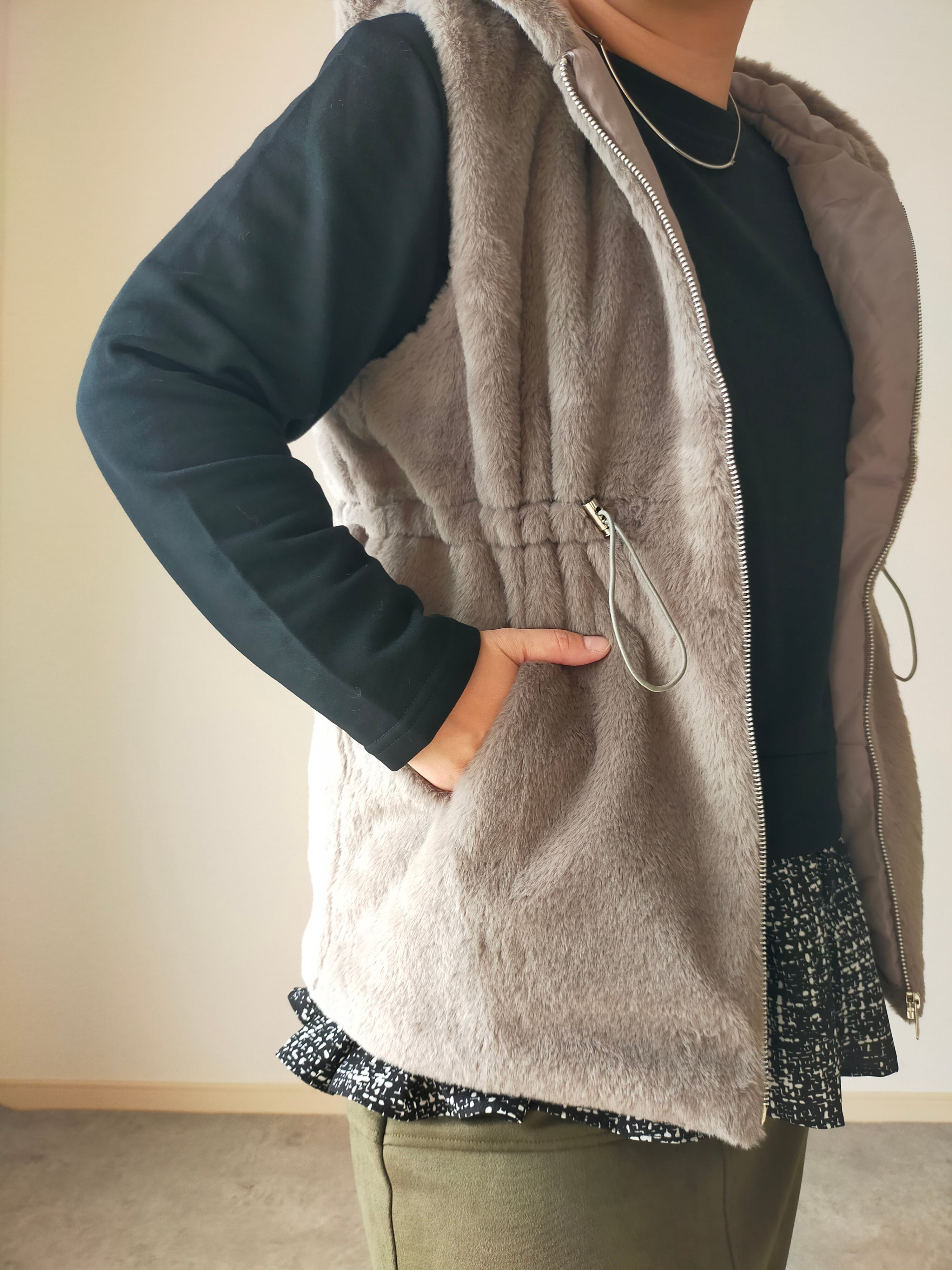 ウエストの絞りで、ストンとしたシルエットとウエストメリハリスタイルの2wayで使えるフード付きベストです