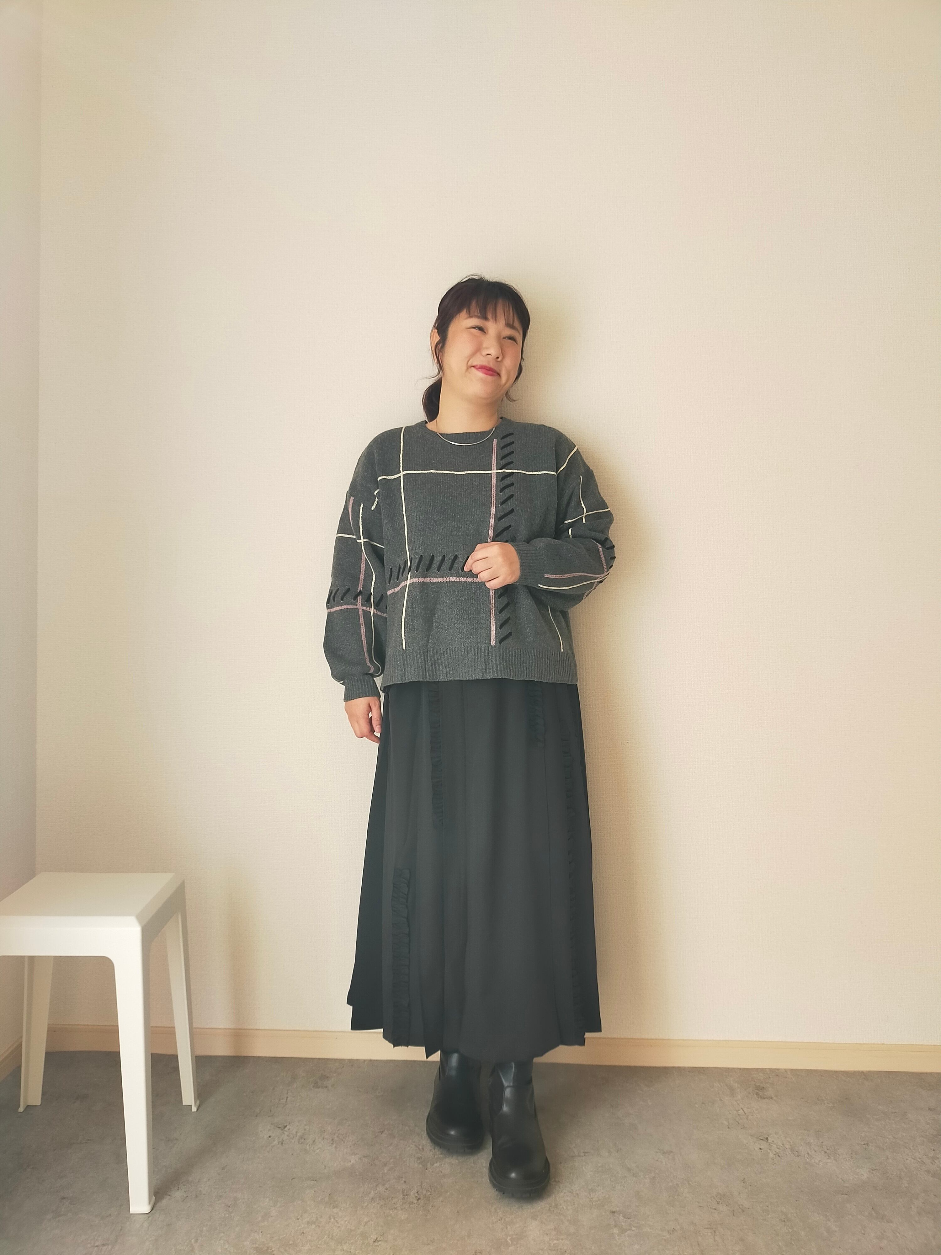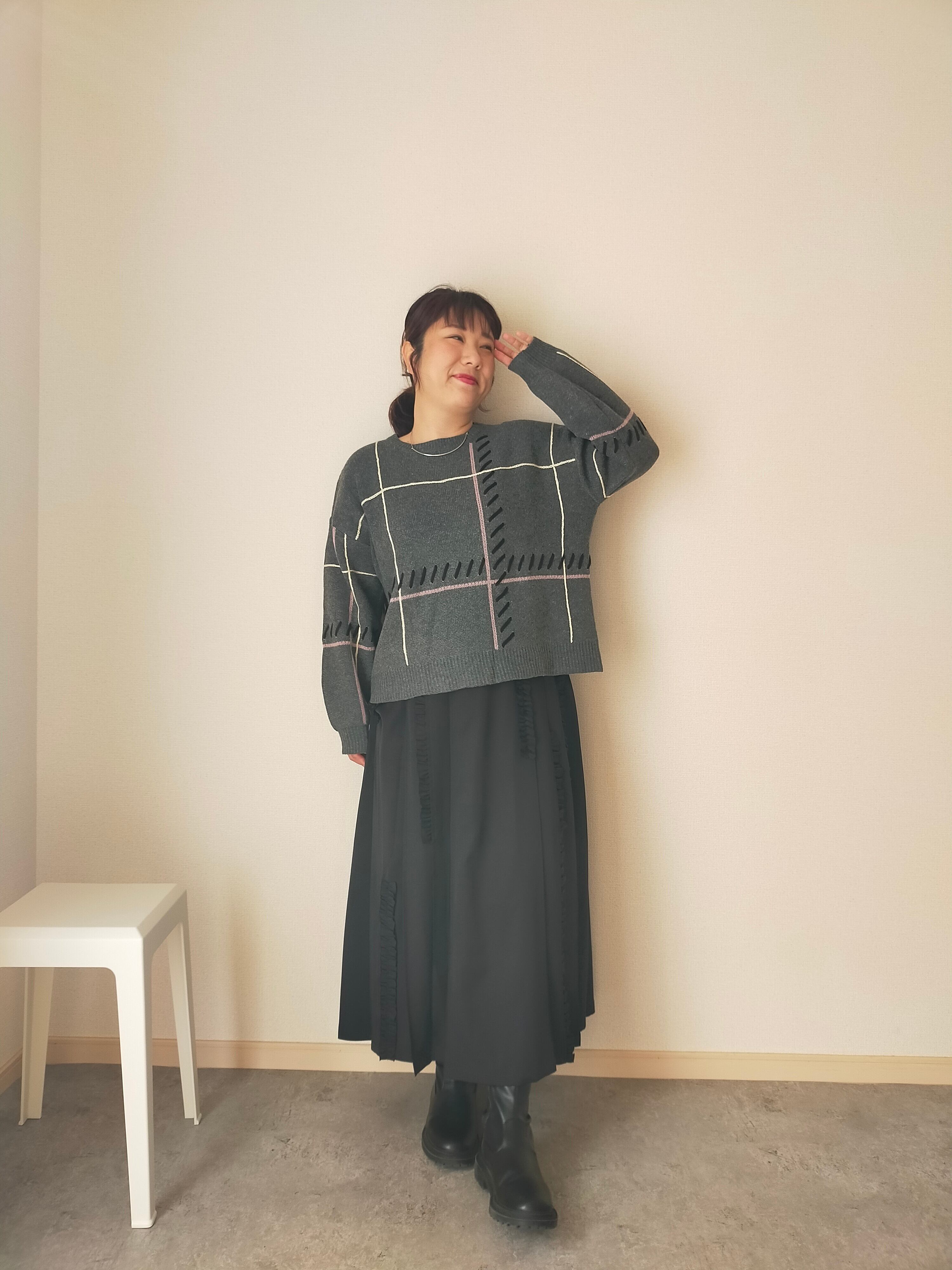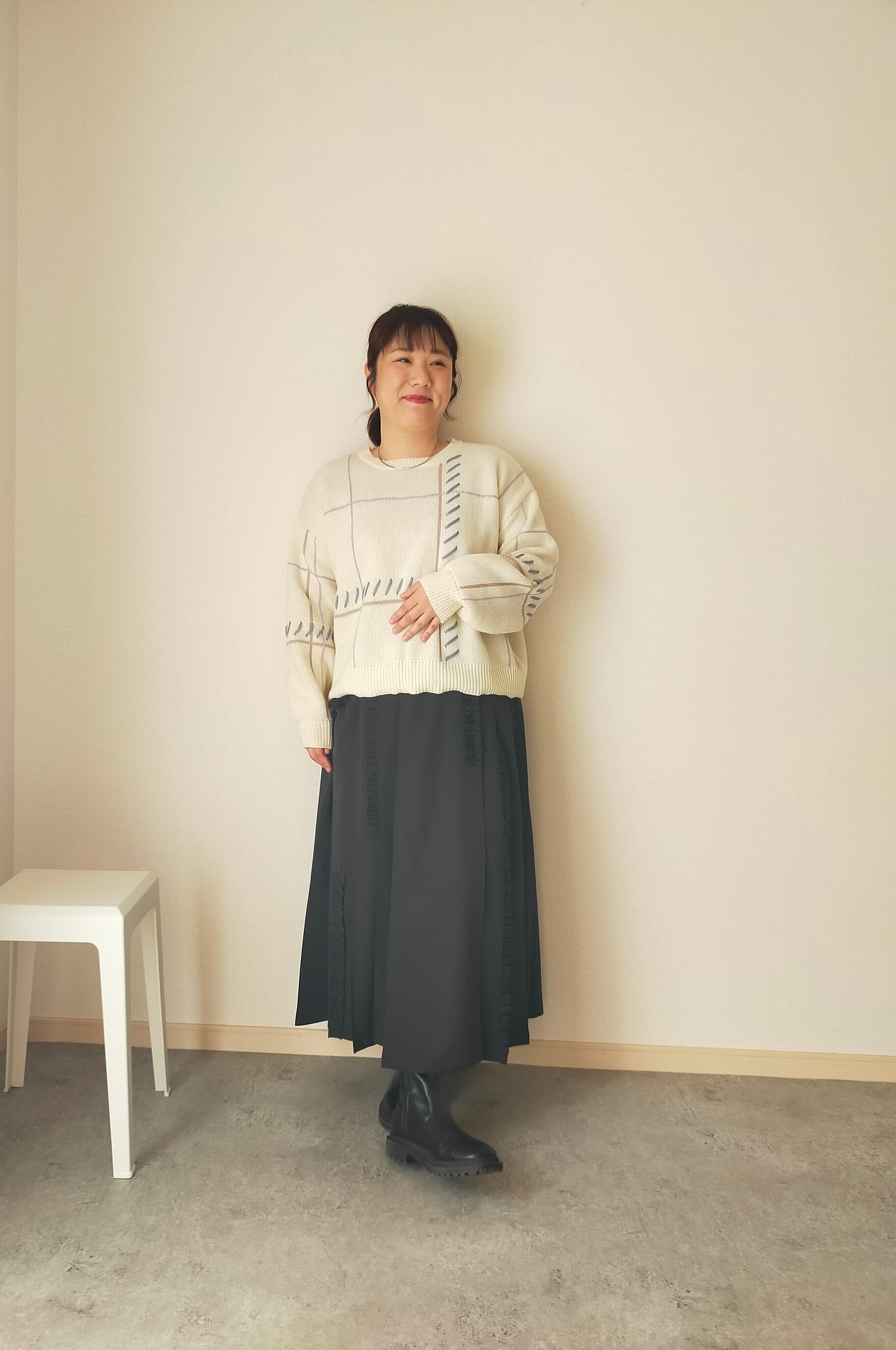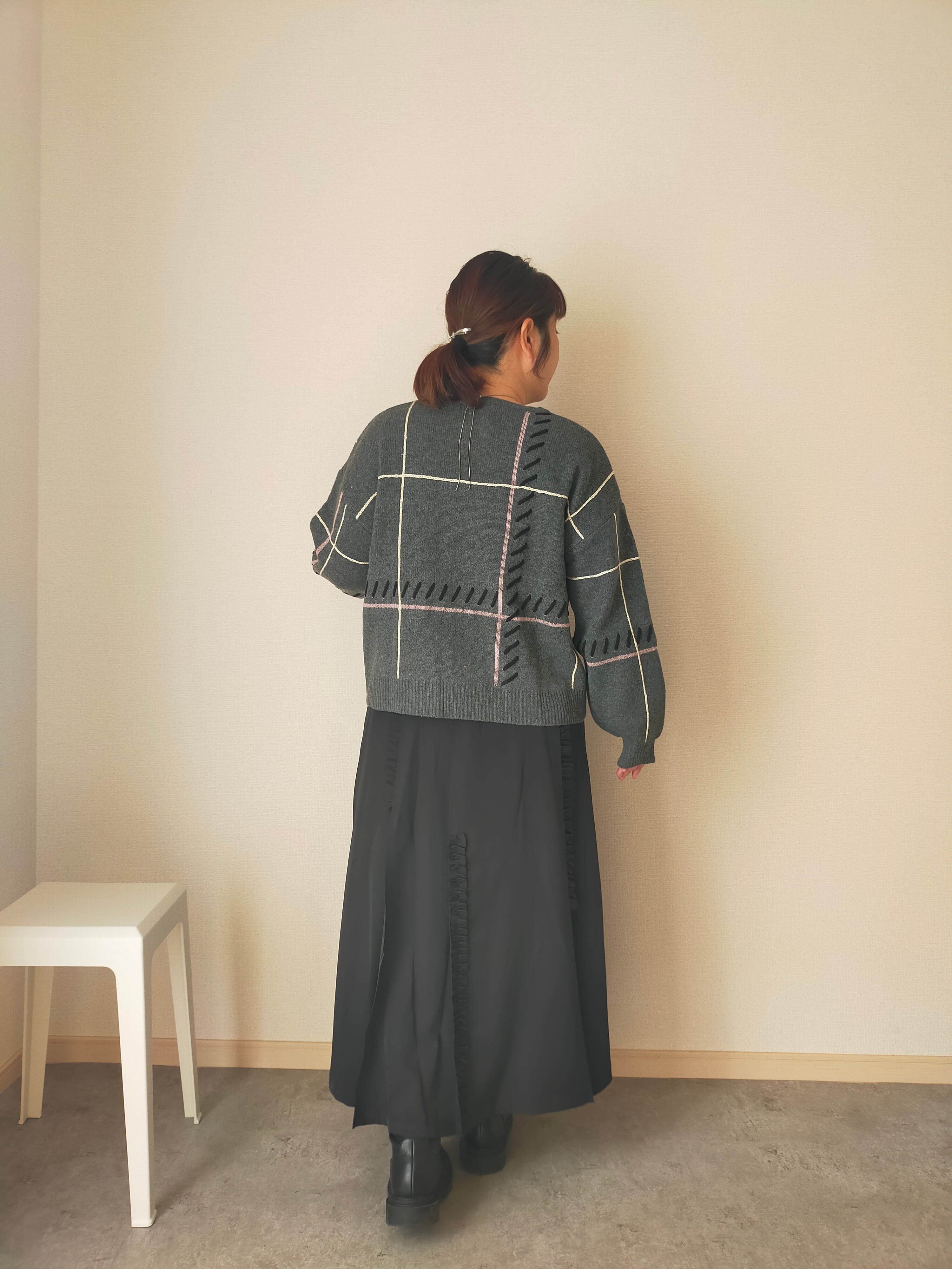 3種類のラインで作ったチェック柄のニットトップス。カジュアルになりすぎないよう、配色にもこだわった一着です。ゆるっとしたシルエットで楽に着用でき、パンツ・スカートどちらにも合わせやすい丈感です。
