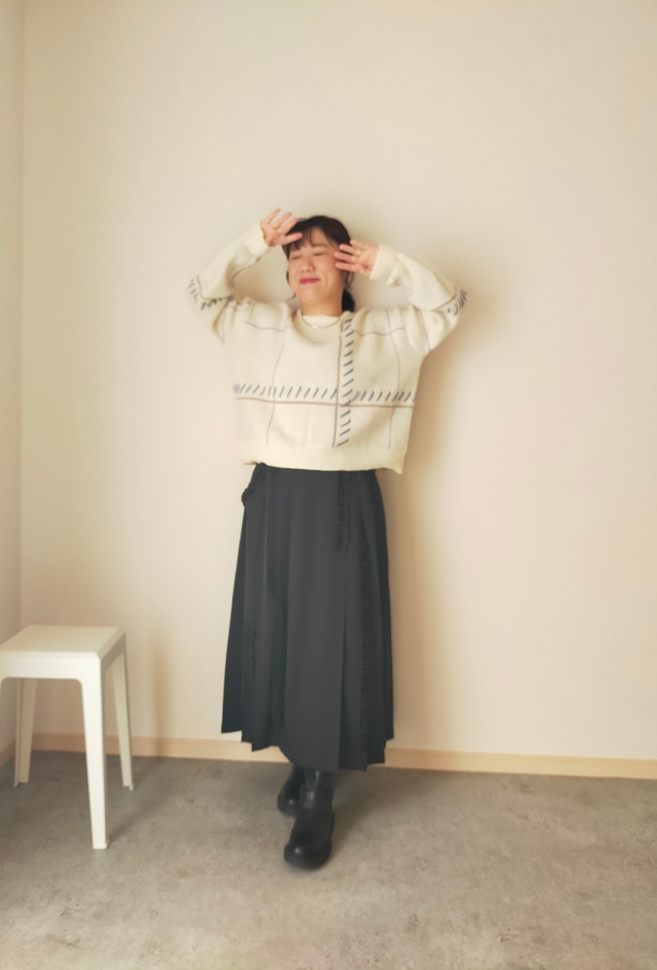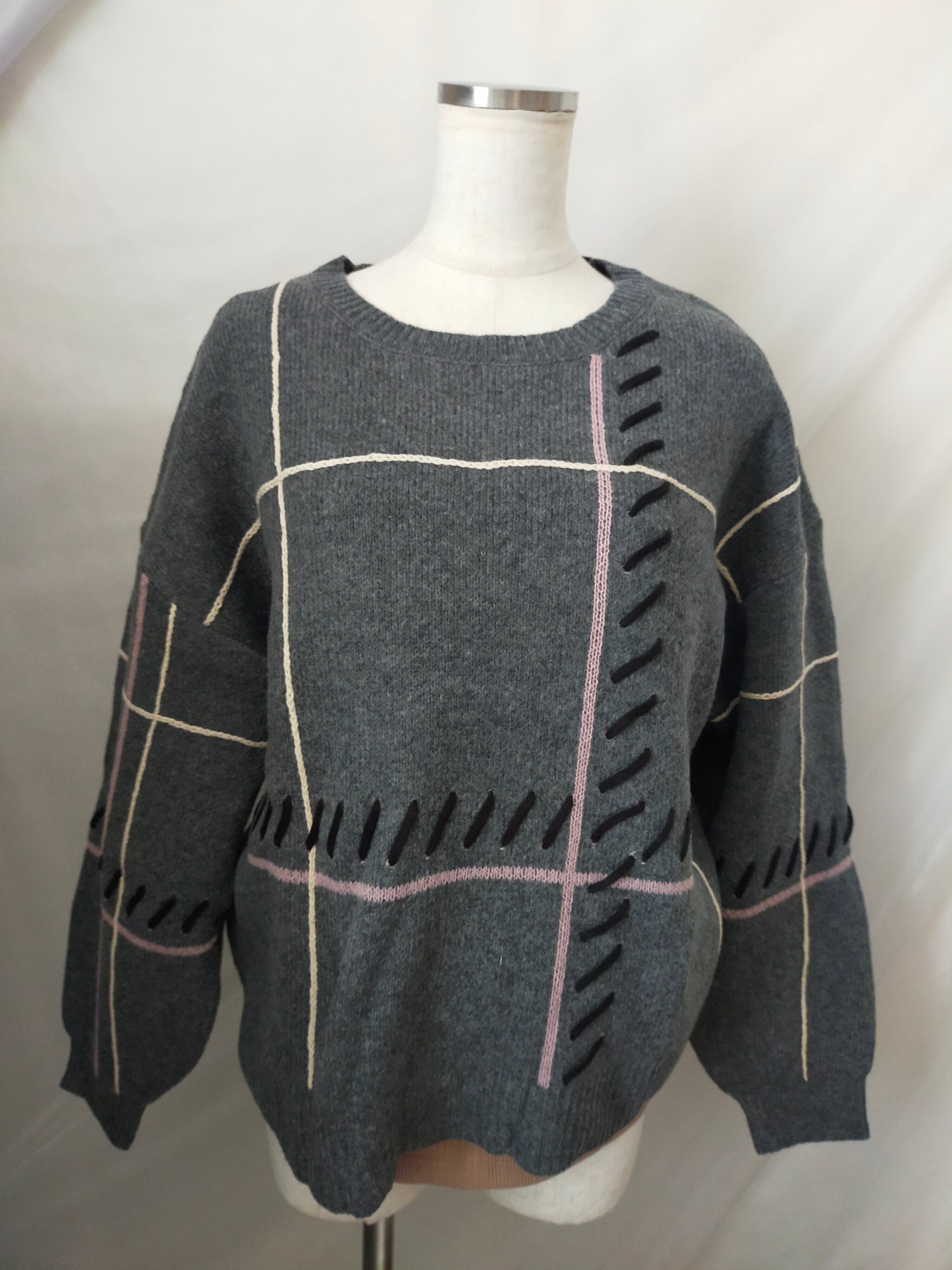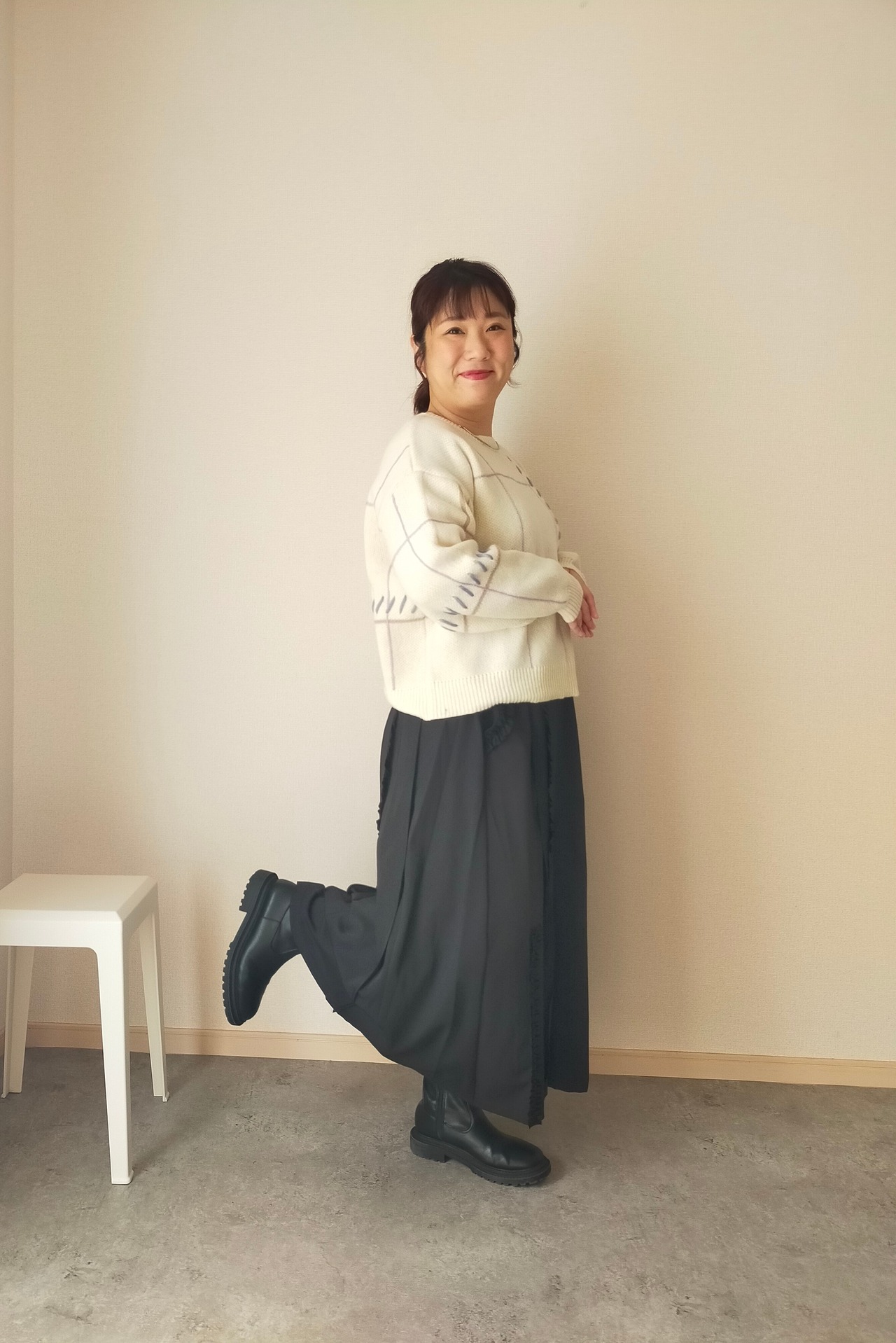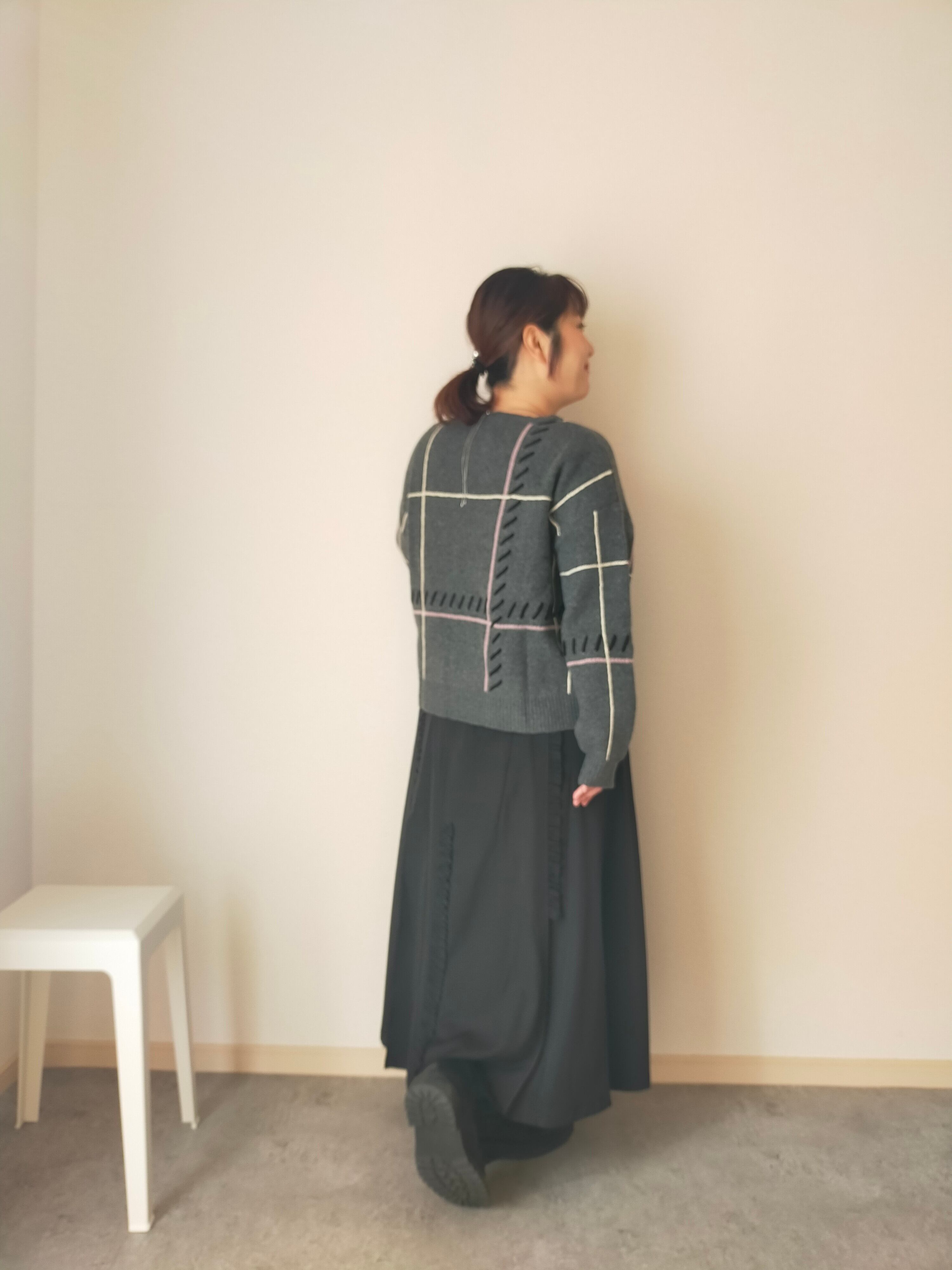 3種類のラインで作ったチェック柄のニットトップス。カジュアルになりすぎないよう、配色にもこだわった一着です。ゆるっとしたシルエットで楽に着用でき、パンツ・スカートどちらにも合わせやすい丈感です。