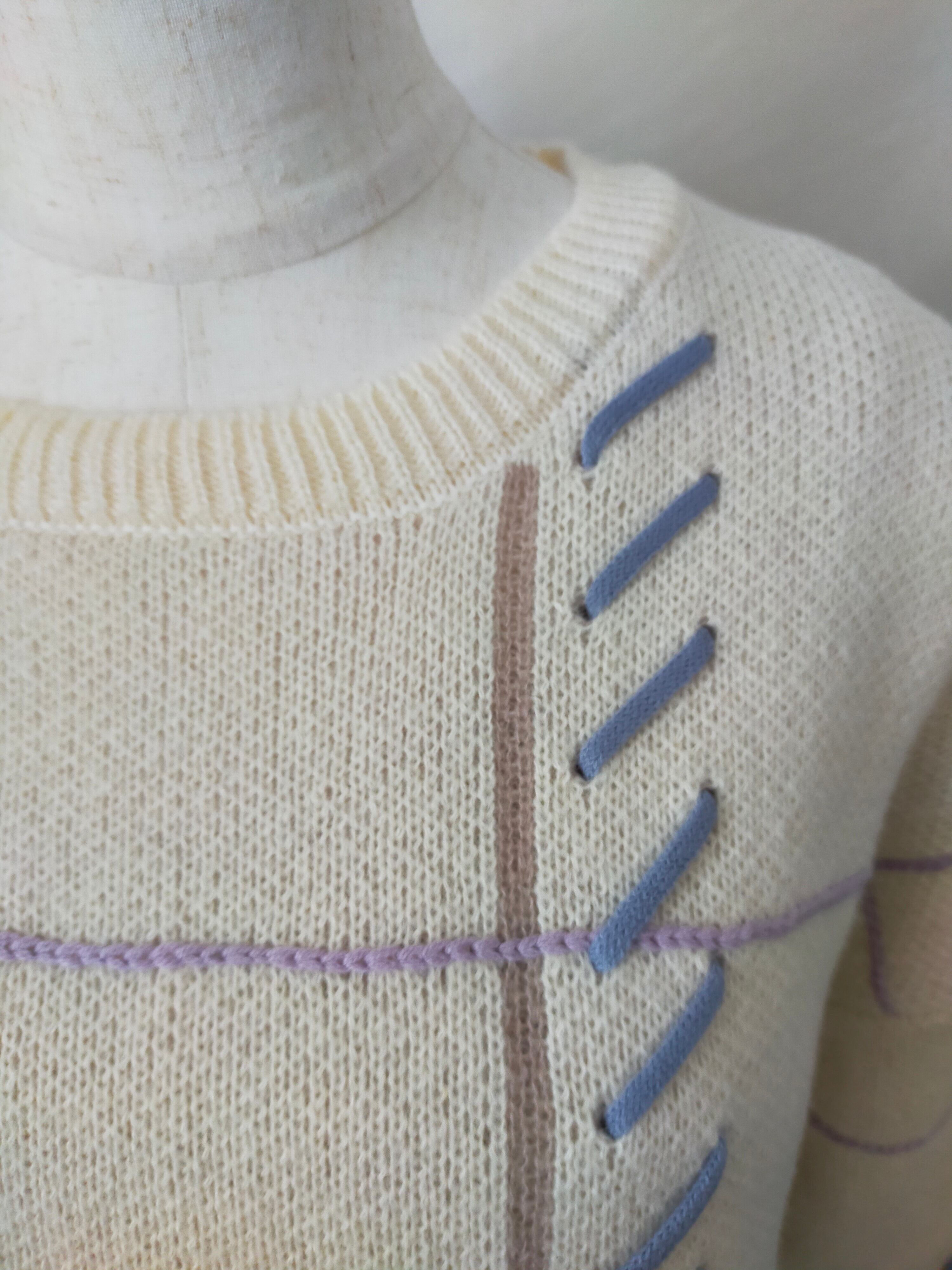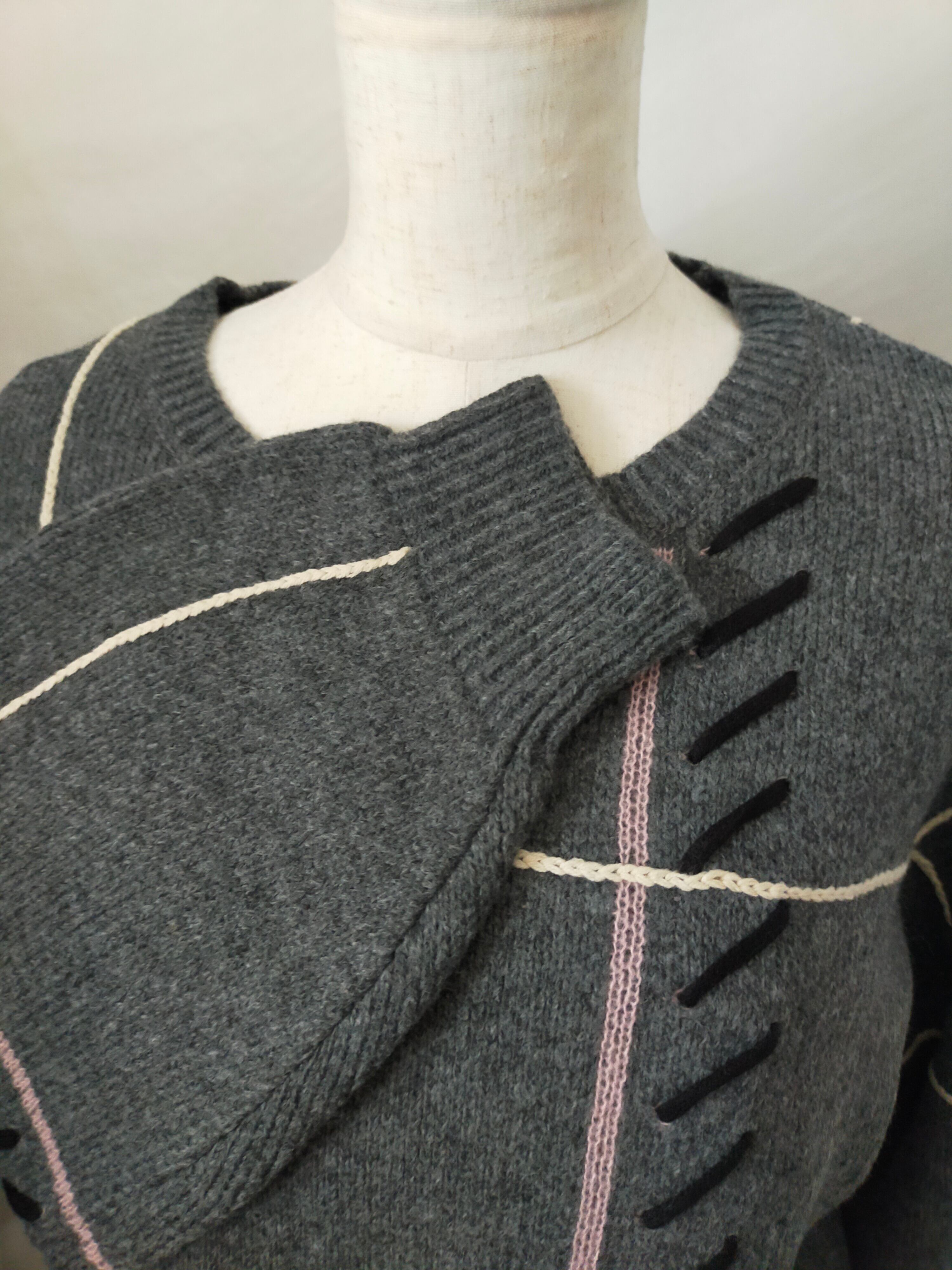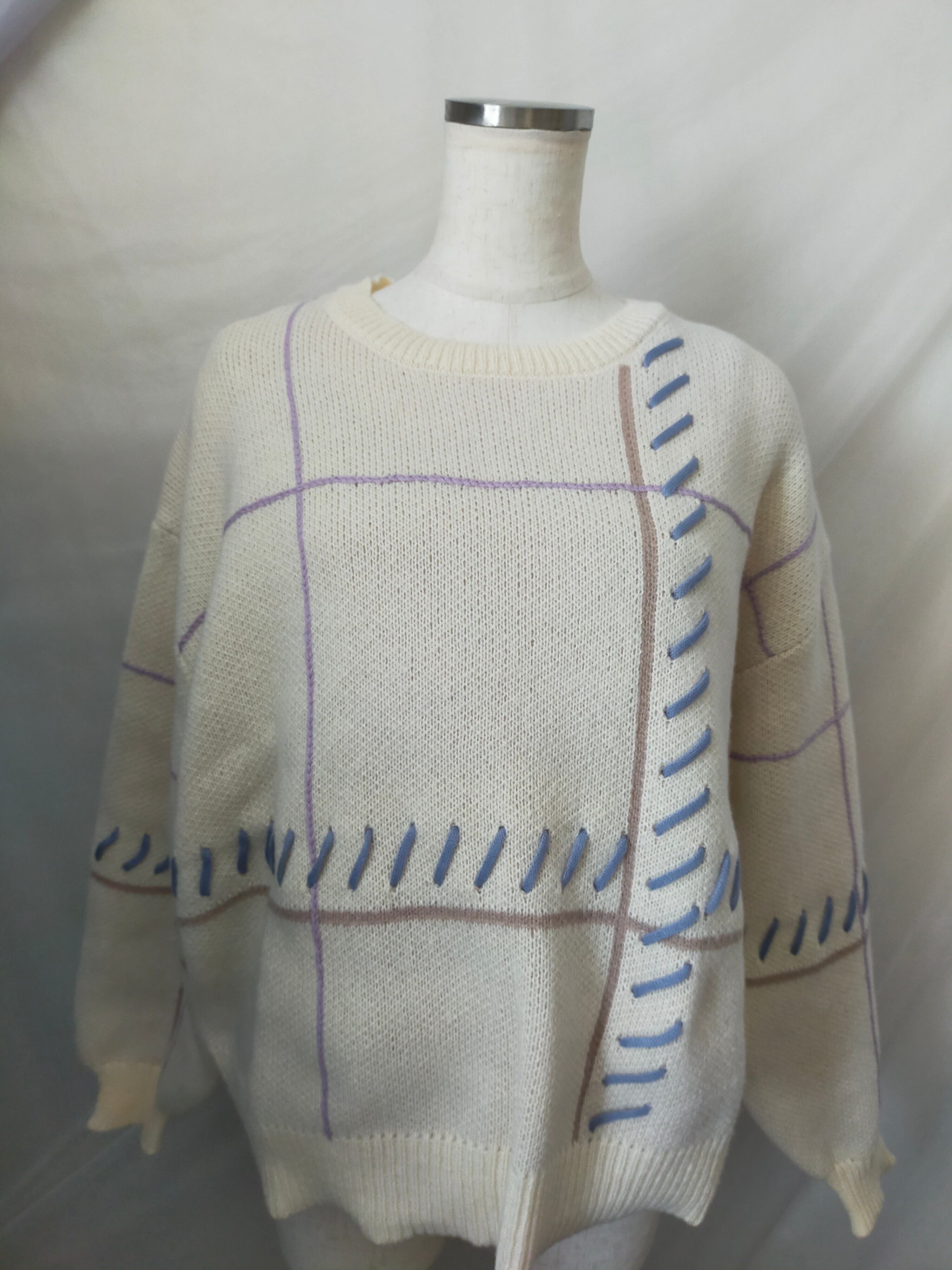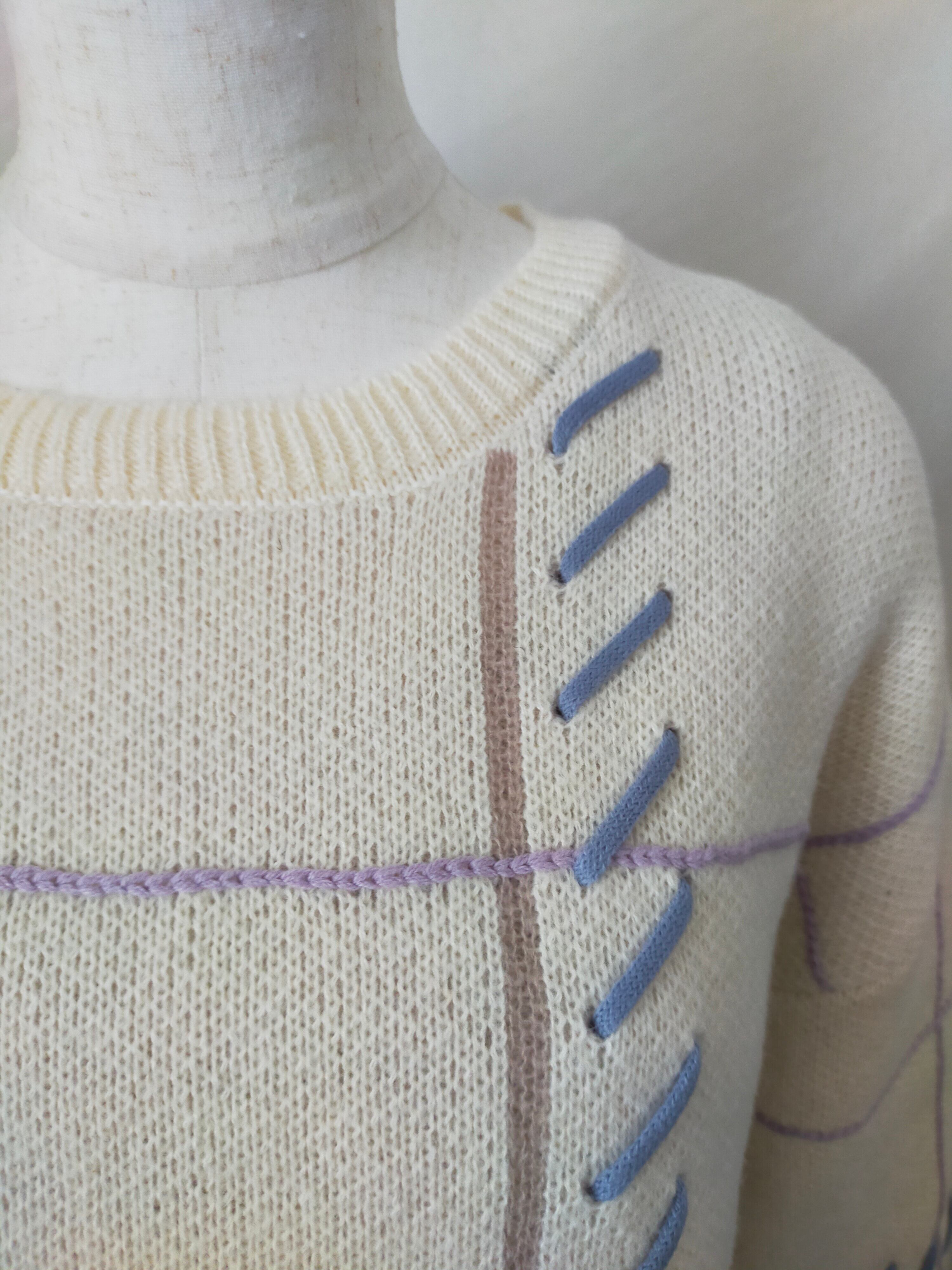 3種類のラインで作ったチェック柄のニットトップス。カジュアルになりすぎないよう、配色にもこだわった一着です。ゆるっとしたシルエットで楽に着用でき、パンツ・スカートどちらにも合わせやすい丈感です。