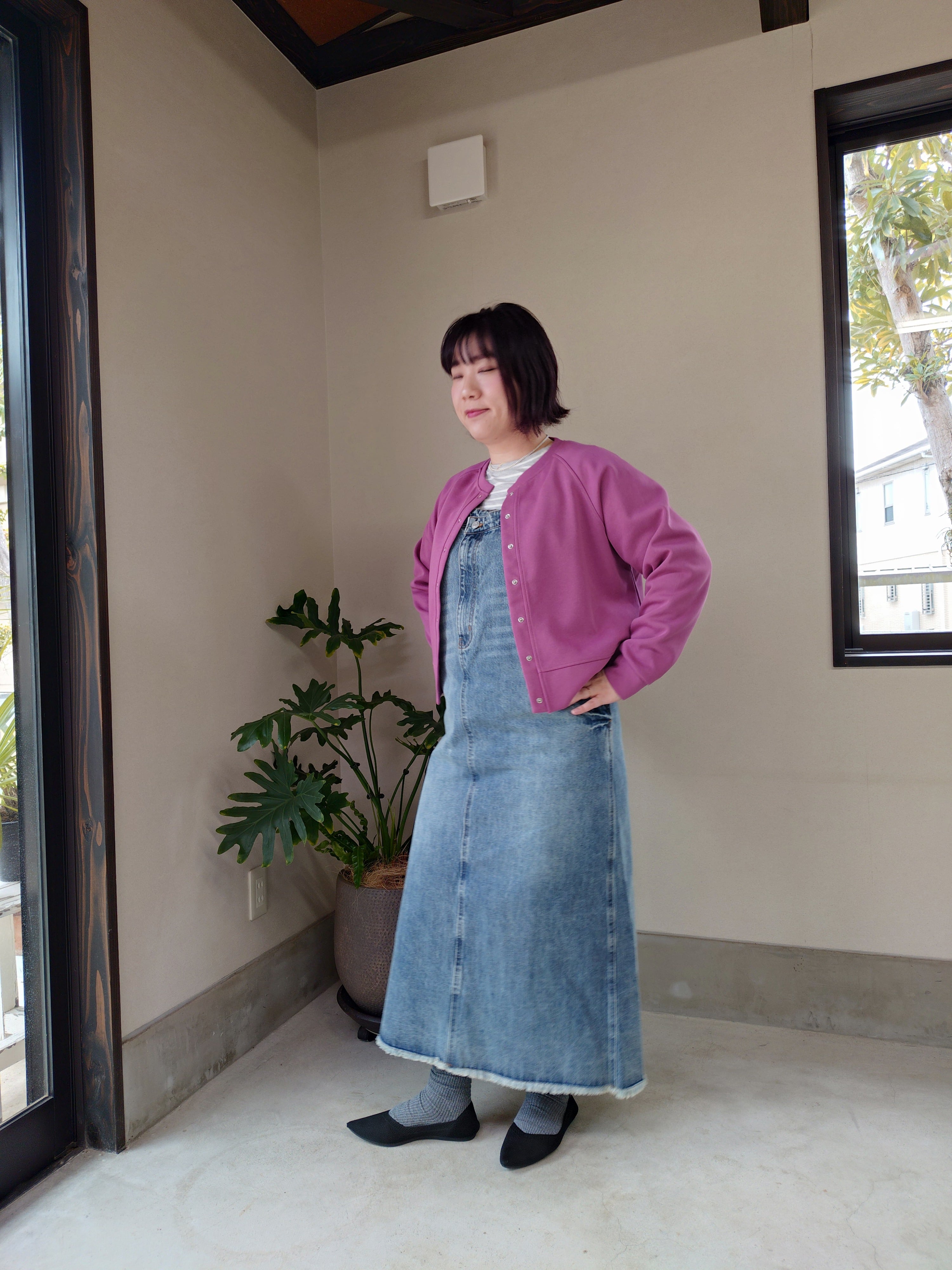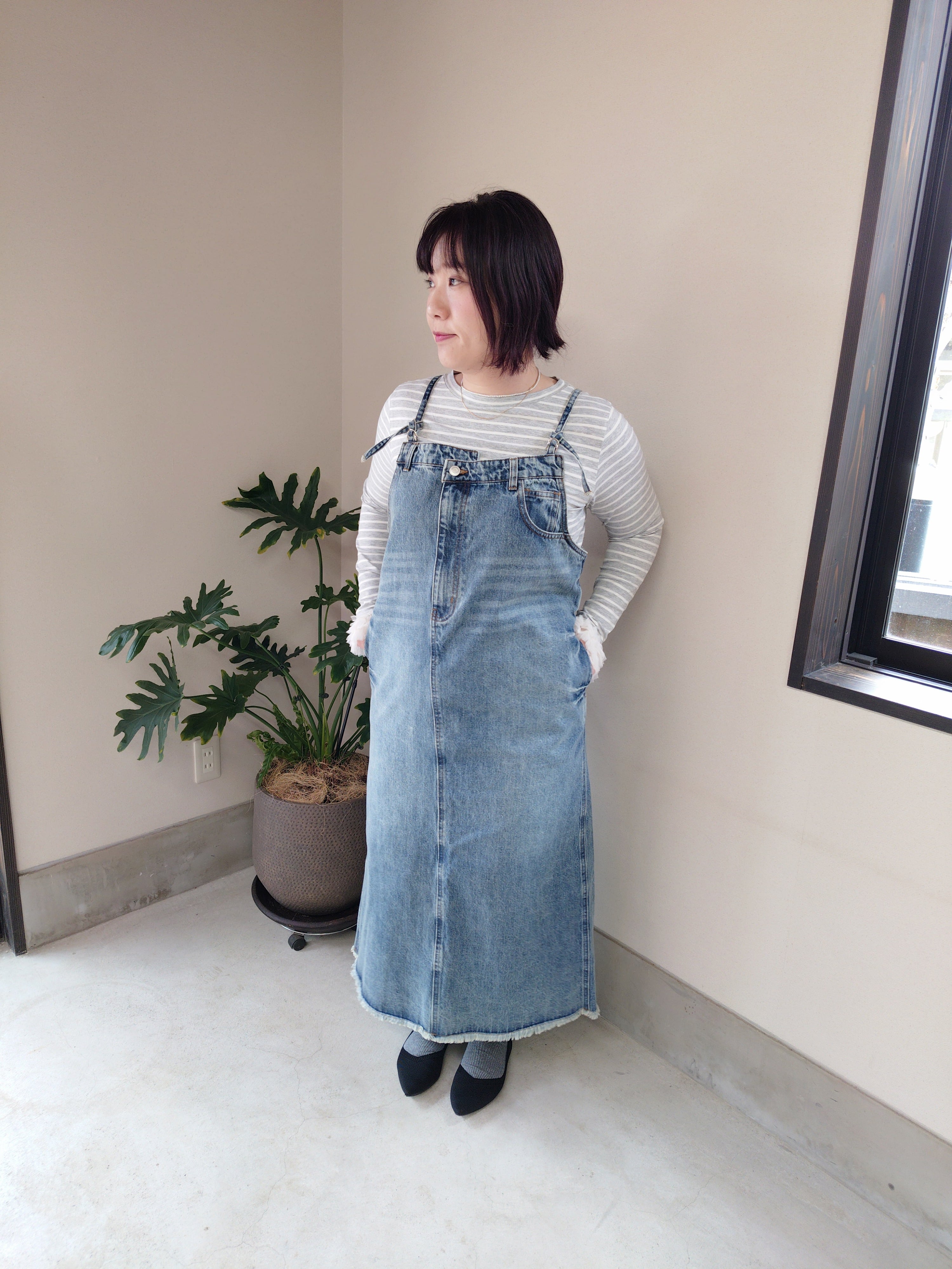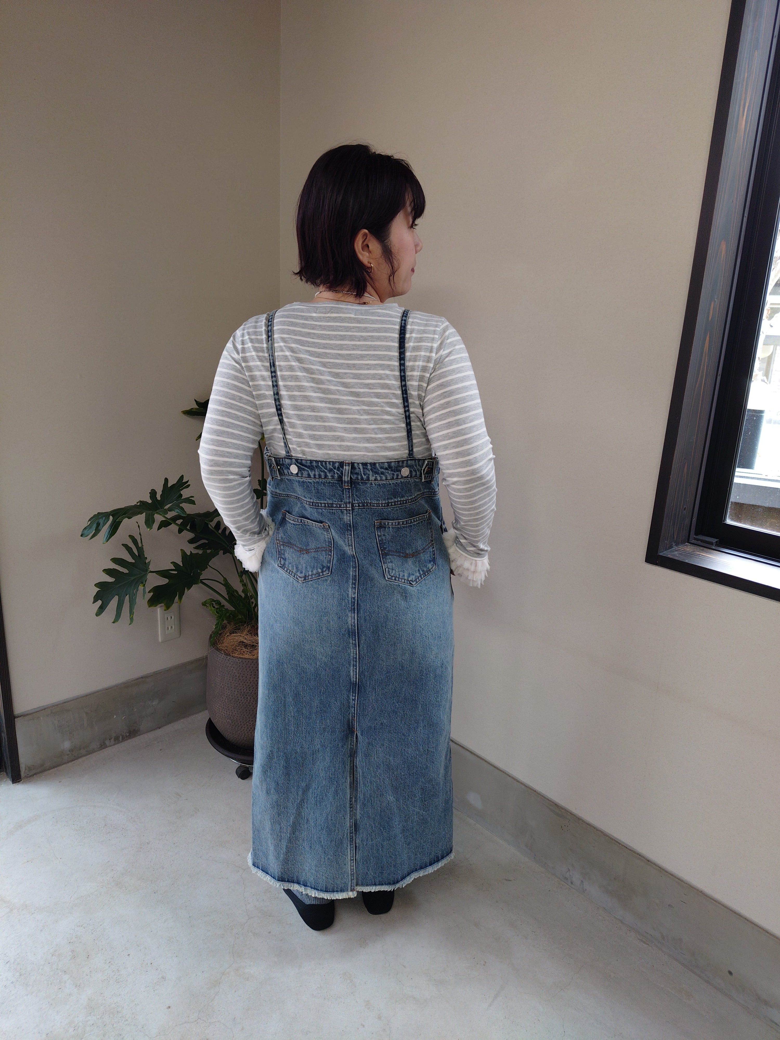 デニムのジャンスカです。幼くなりがちなデザインですが肩紐を華奢にすることで女性らしさもだせます。