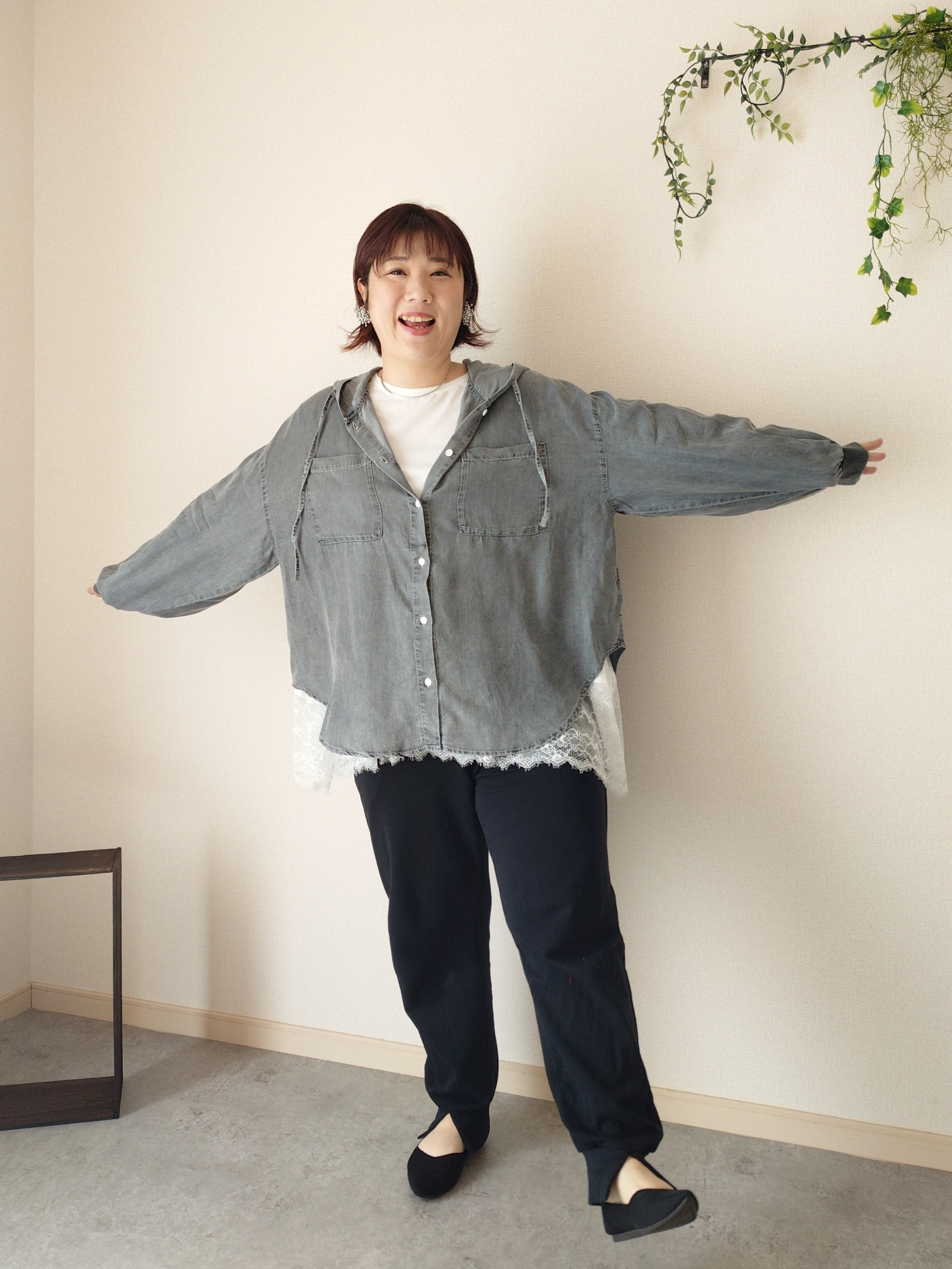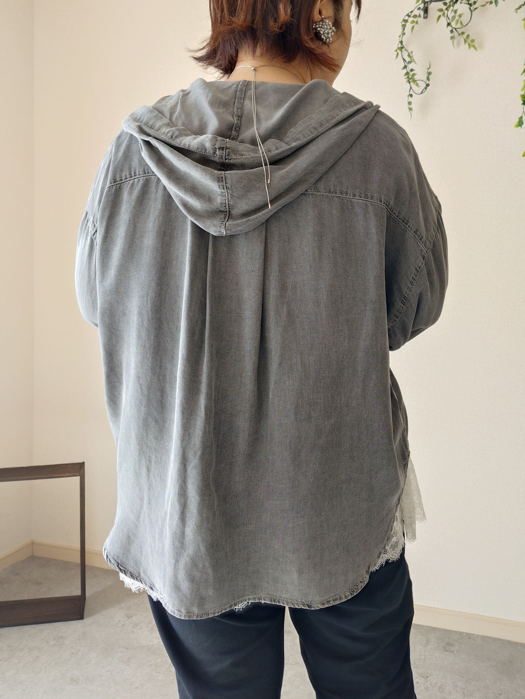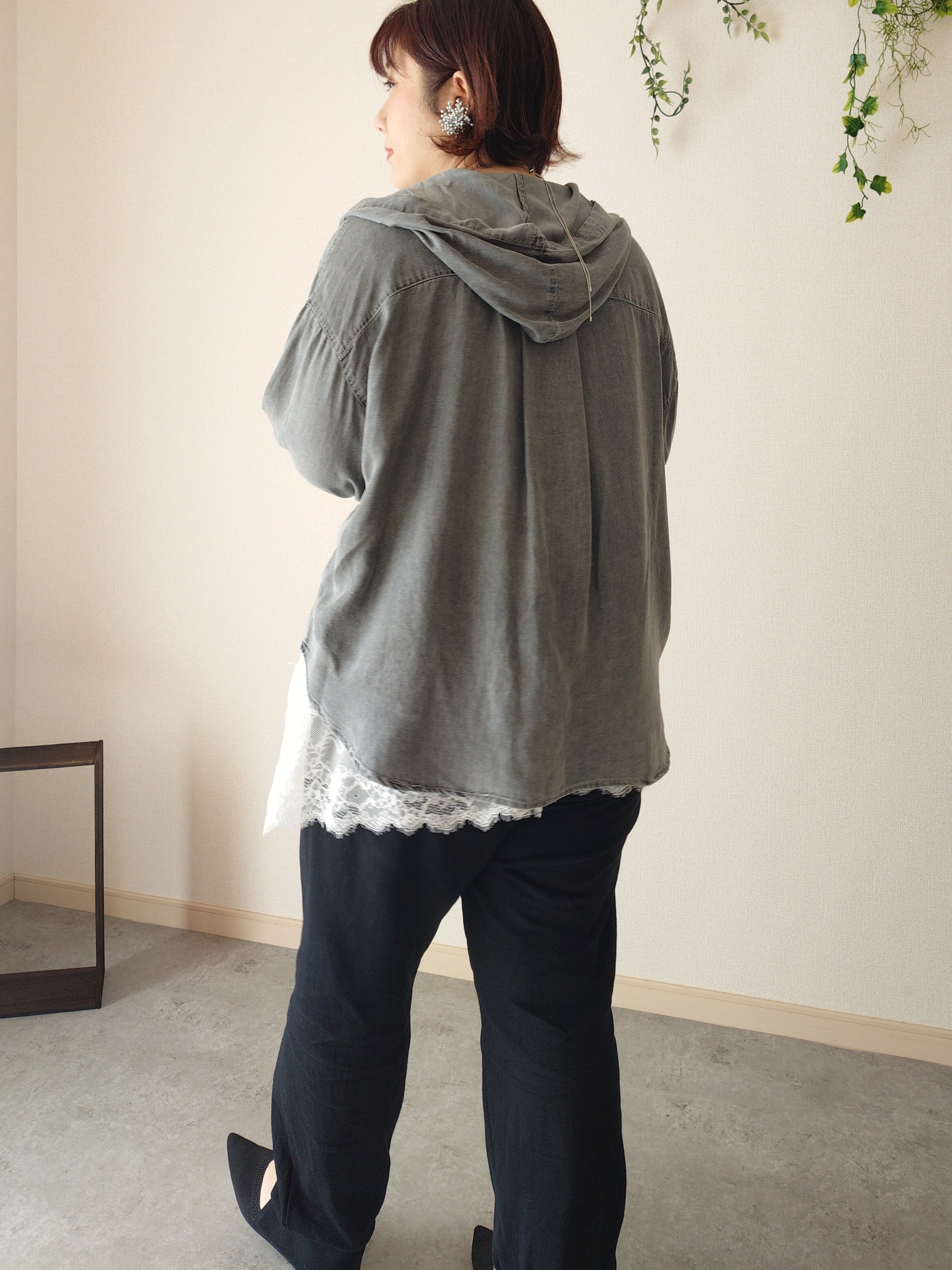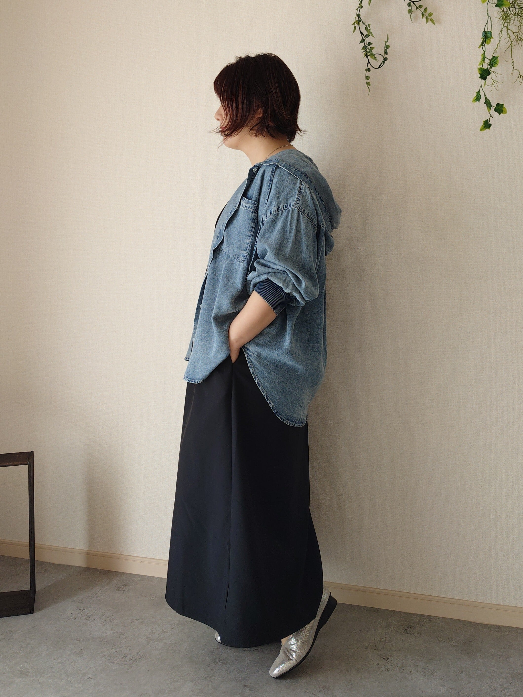 ボタンをあけて着るとスッキリとしたネックラインになり、フードとデニムで子どもっぽくなりそうなのに大人に合うデザインで、カジュアルなのに女性らしさのある1枚です。
