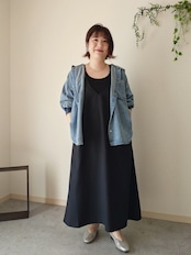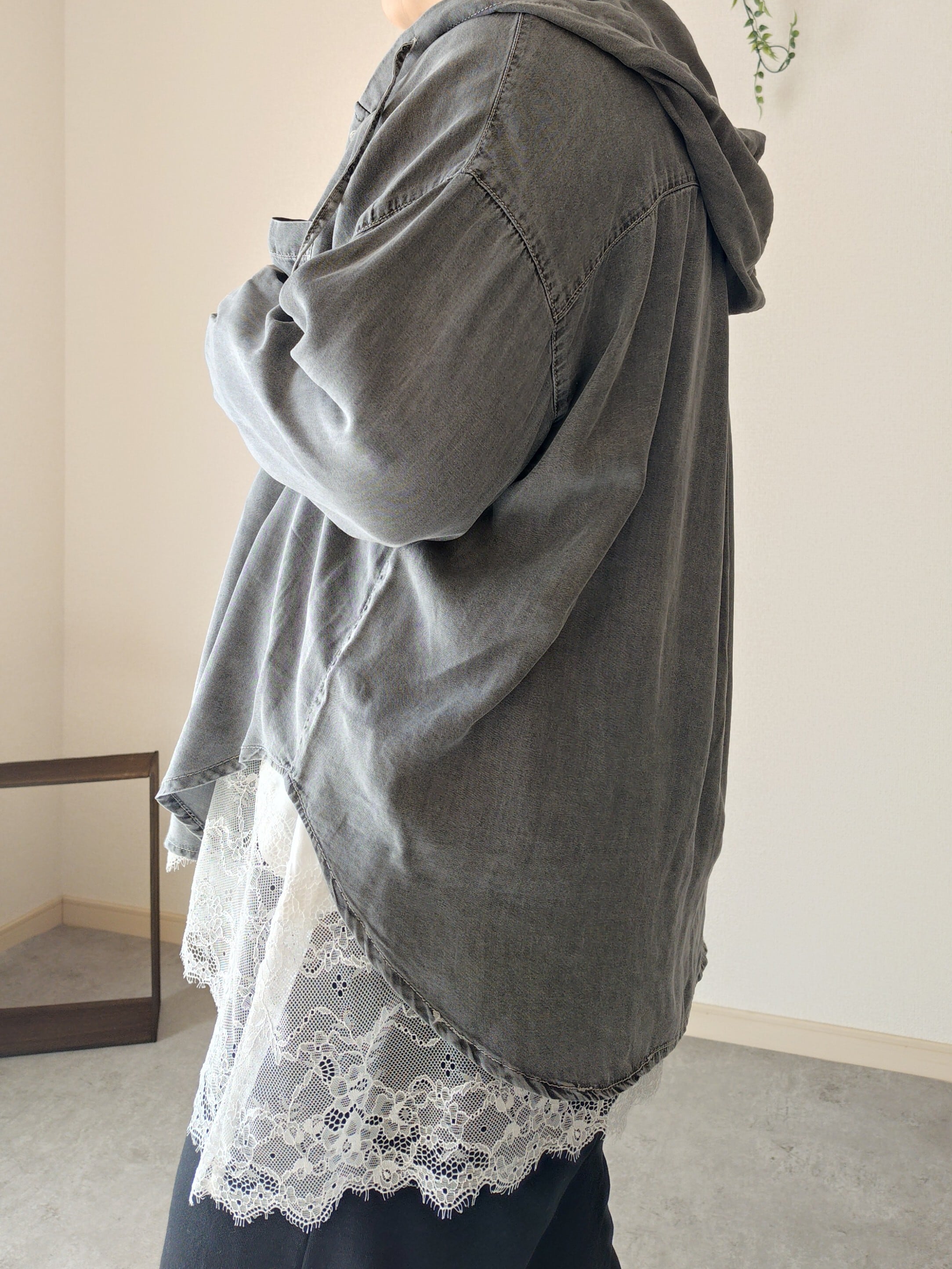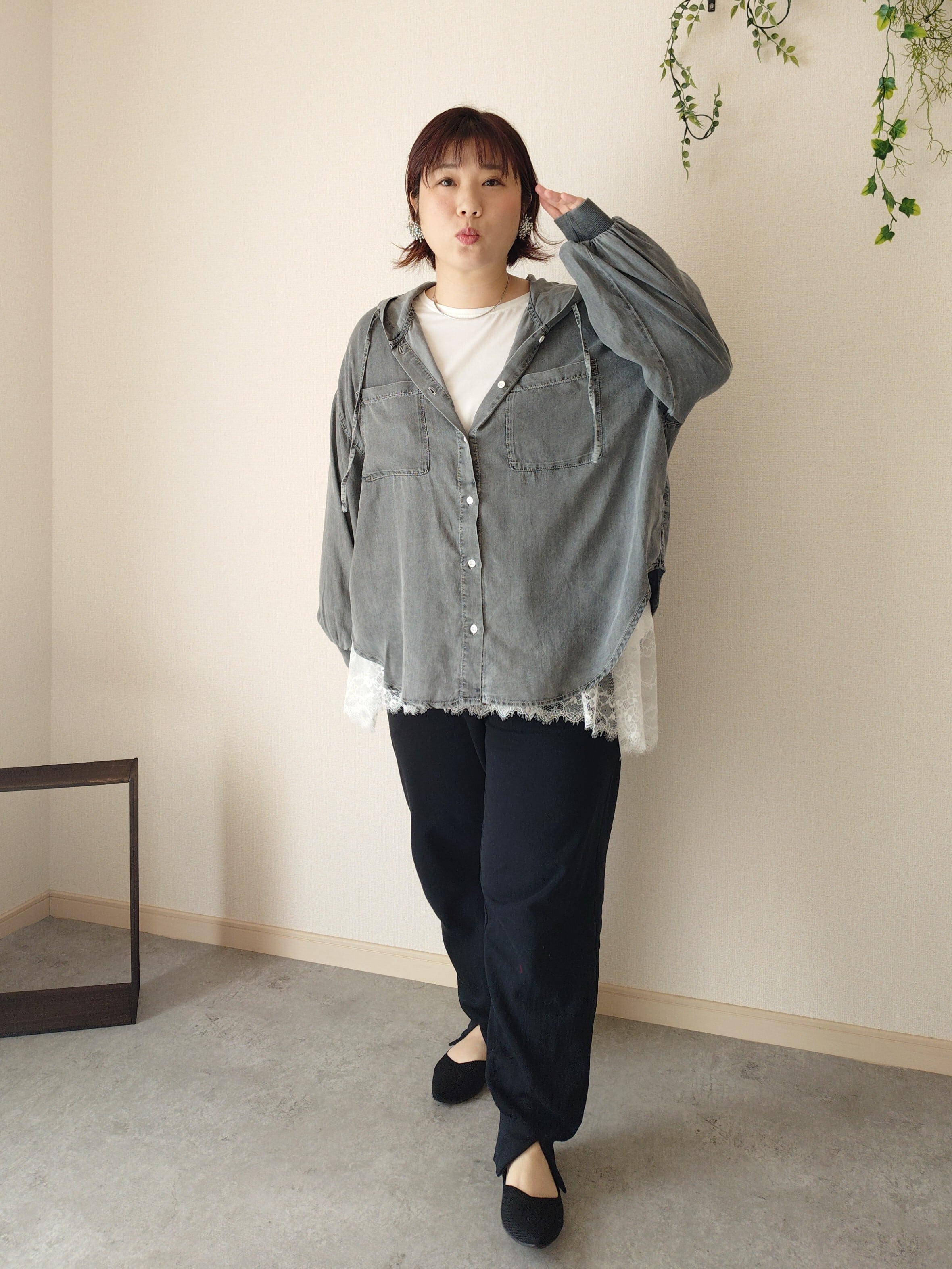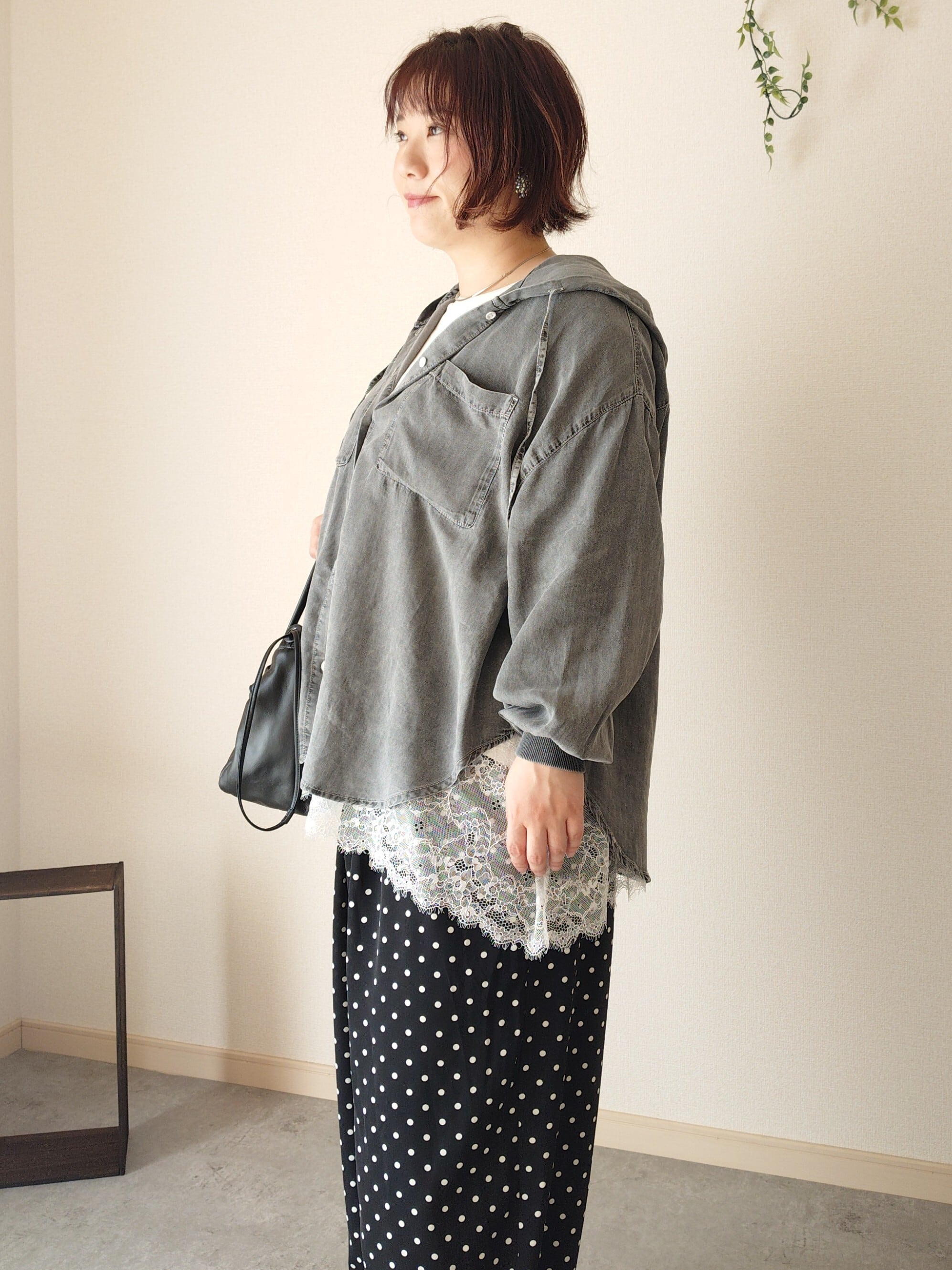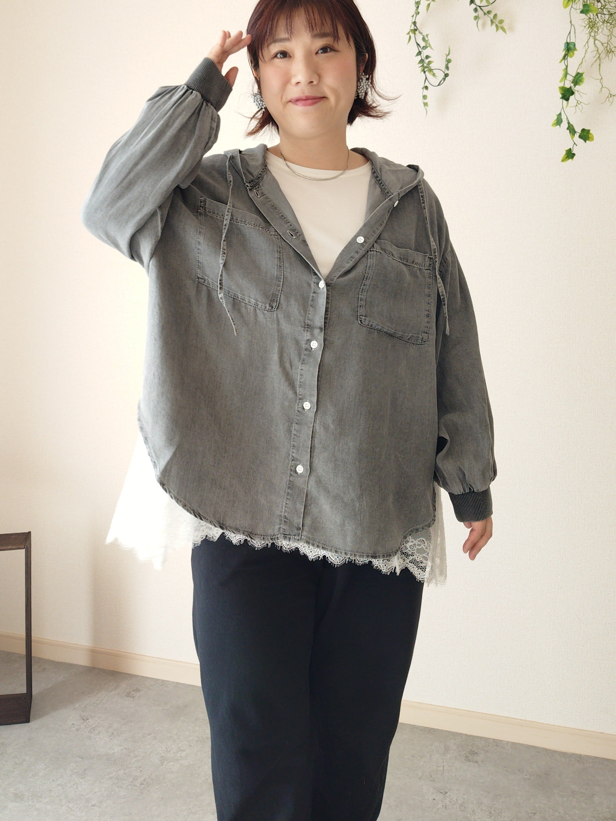 ボタンをあけて着るとスッキリとしたネックラインになり、フードとデニムで子どもっぽくなりそうなのに大人に合うデザインで、カジュアルなのに女性らしさのある1枚です。