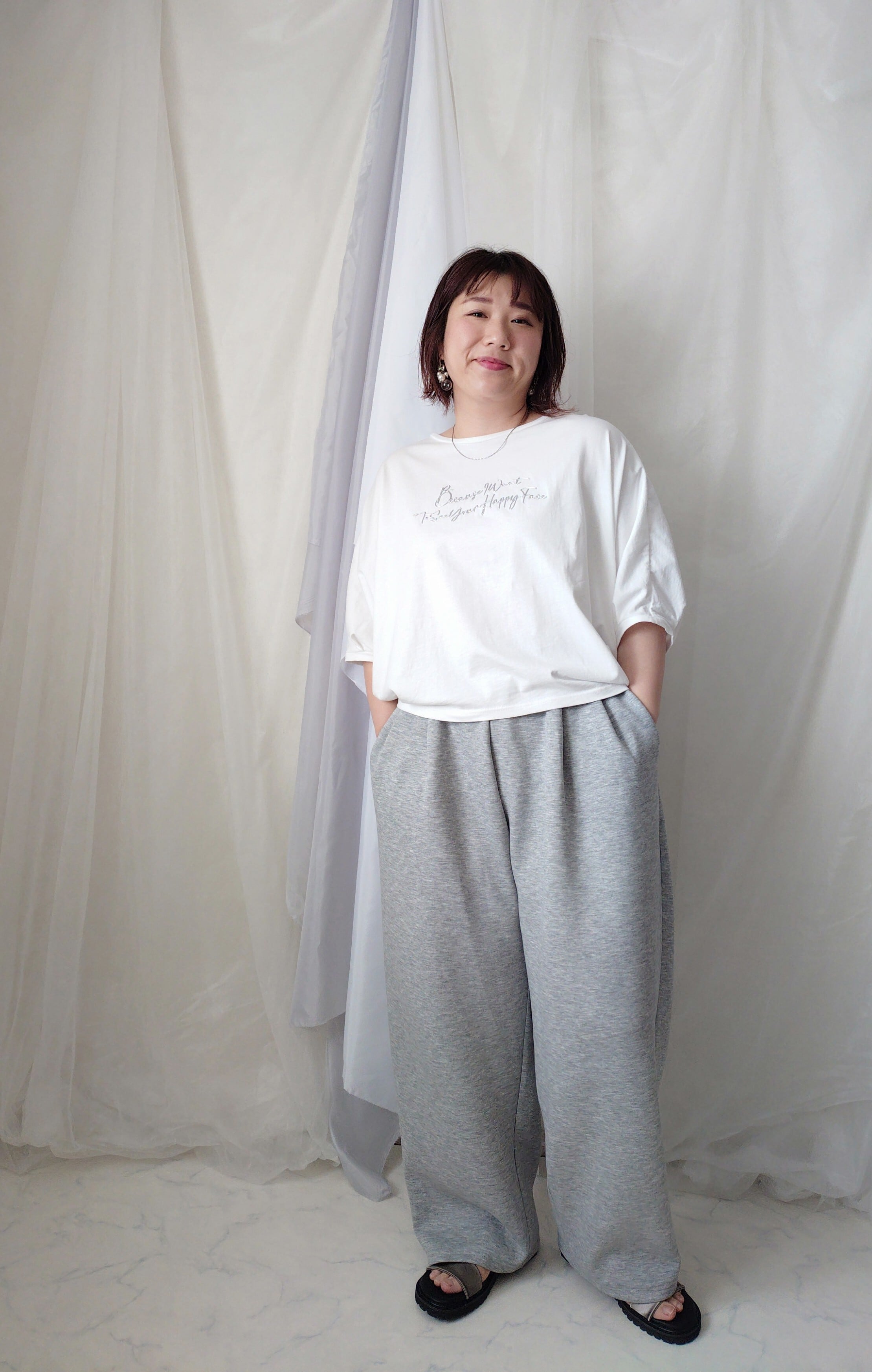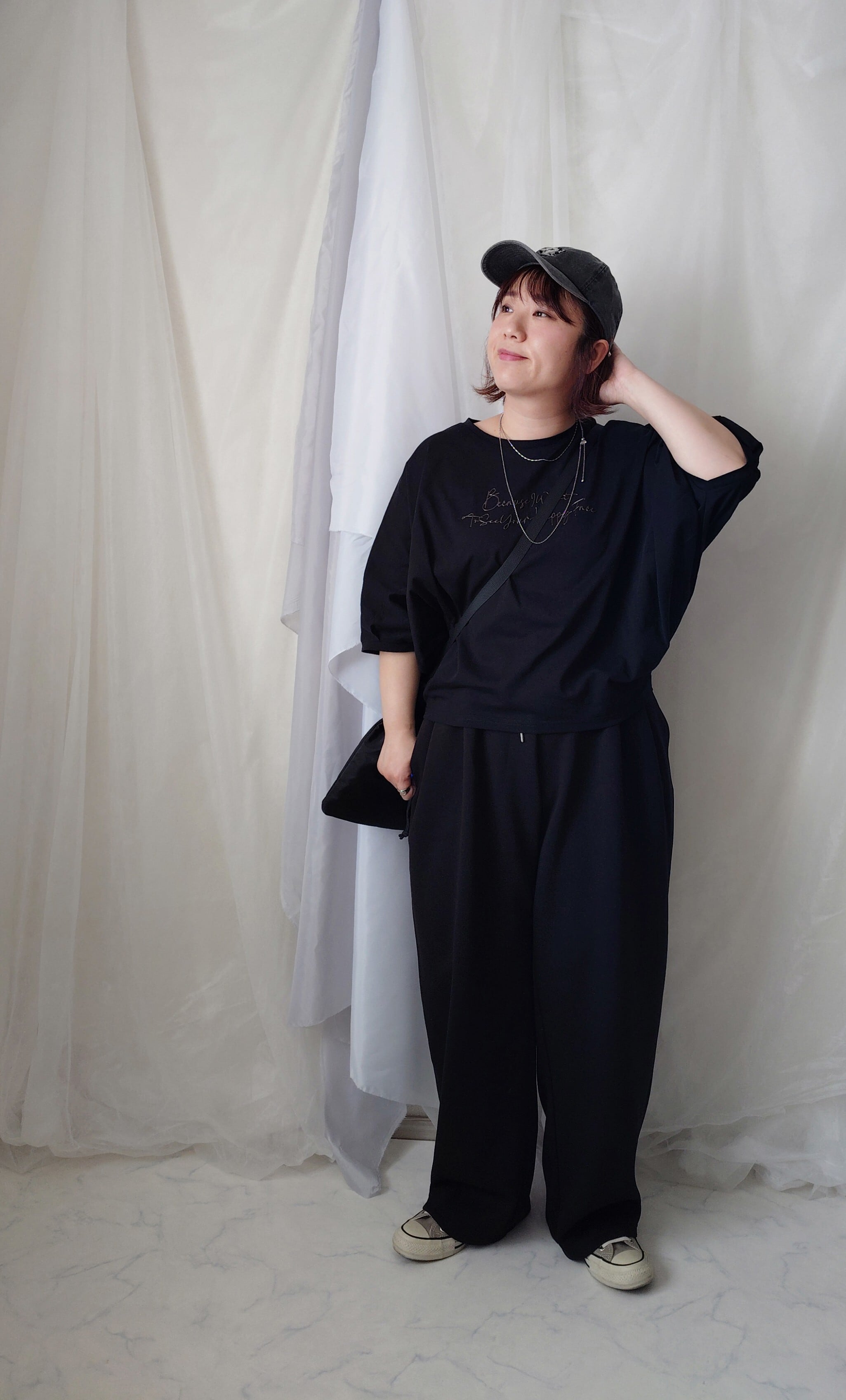 普通の綿スウェットより、ちょっとだけきれい見えする印象の素材です。ウエスト、お尻、太ももすべてちょうどで洋梨体型さんにおすすめの1枚です。この前のドットと同じ形ですが、素材が違ってこちらのほうが腰回りふわっとします。紐がカジュアルなので、隠せばクロならきれいめにも!